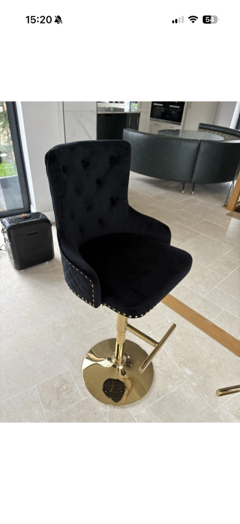 Stunning black and gold velvet bar stools with KNOCKBACK on the back on the chair