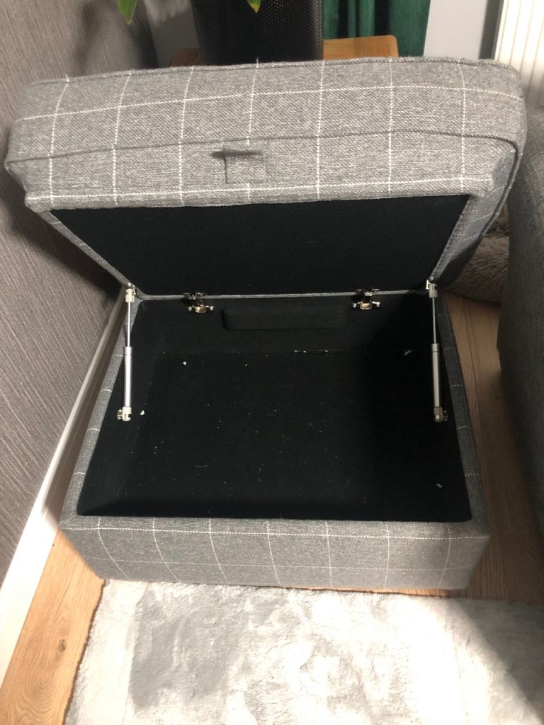 Lovely grey fabric footstool with a pattern, perfect for any living room.