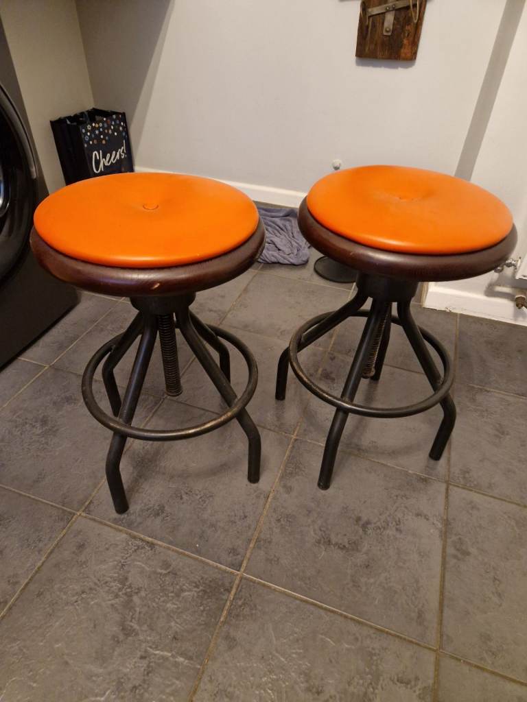 Two black heavy metal bar stools in very good condition with orange seat very well made and adjustable great as a bar stool or for a breakfast bar.