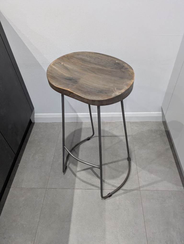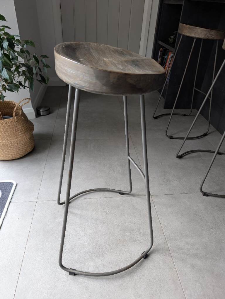 Seat hand crafted from Mango wood. Mango wood has alike levels of durability to other hardwoods such as oak and ash. Each bar stool is tenuously unique, has industrial style finish. Strongly made metal frame with wooden shaped seat. This Bar stool is inspired by industrial design with a vintage wood top shaped for comfortable seating. RRP £84.99 each. Don't confuse with the cheaper version on the internet, these are the real deal, better quality.