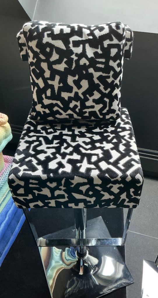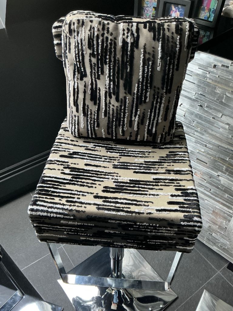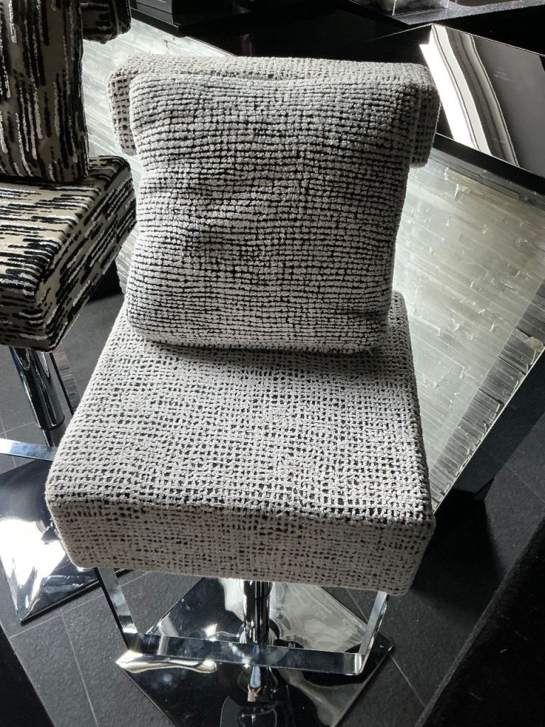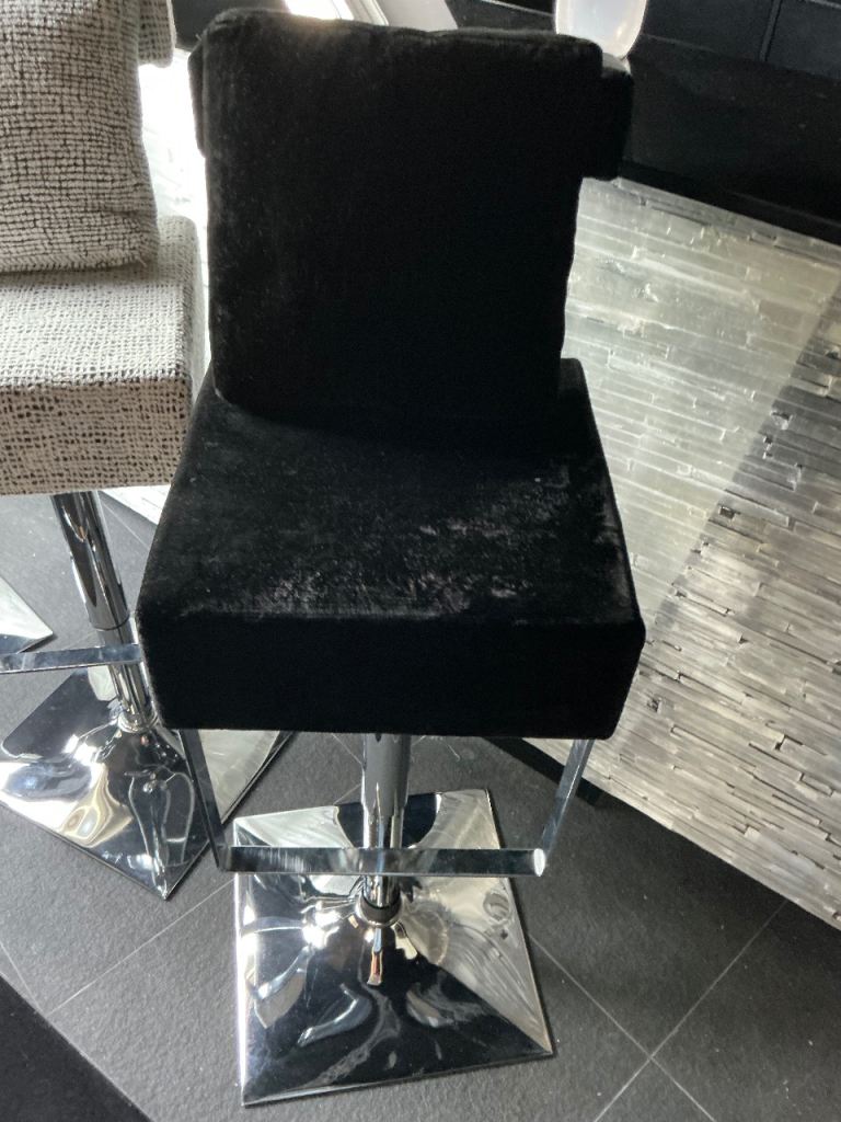 Set of 4 swivel, adjustable stools with foot and back rest. Come with a matching cushion. Back rest height 113cm, Crome base 42cm square, seat can be adjusted from 90cm height to 70cm height. In excellent condition.