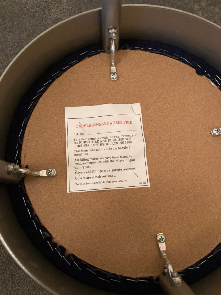 Sturdy metal stool with a comfortable dark blue fabric seat. The frame is silver/grey and has unique wavy legs, adding a bit of character. As new condition with no damage