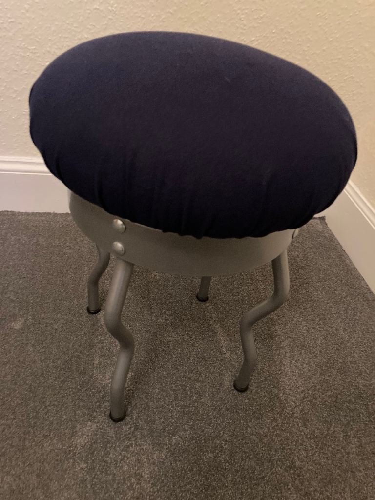 Posting for 5+ yearsSmall metal stool with blue fabric seat