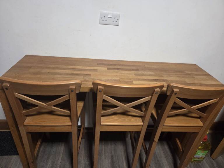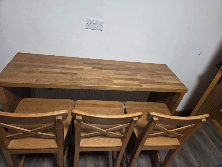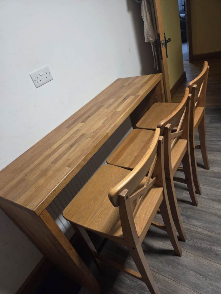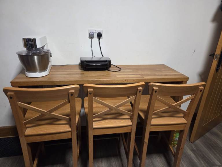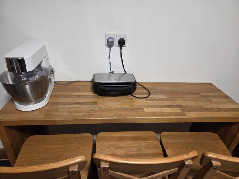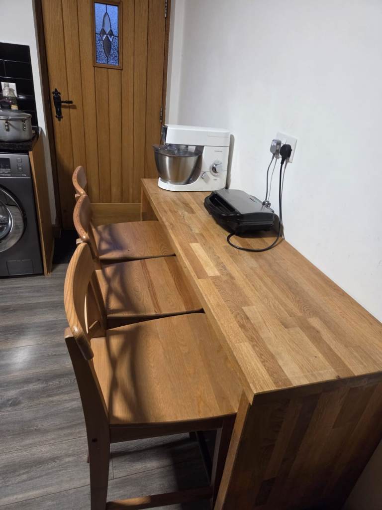 Solid oak breakfast bar in butchers block style made from IKEA worktops - really expensive to buy, so this is a steal.