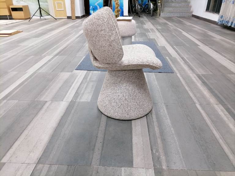 Upholstered in a premium, speckled neutral fabric, the Aris presents a surface alive with detail. The soft, off-white or beige base is artfully scattered with subtle darker flecks of brown and gray, creating an organic, stone-washed texture that is deeply tactile and visually engaging. This is not a flat color; it’s a complex, natural pattern that ensures no two chairs are exactly alike, adding an artisanal quality to its modern form.
