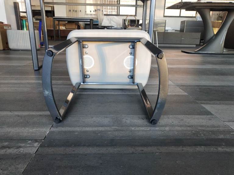 Base: Matte charcoal metal legs with U-shaped curved supports