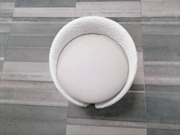 The Haven captivates through a masterful play of textures. Its defining feature is an embracing outer shell, meticulously crafted from sumptuous bouclé fabric. This dense, softly textured wrap creates a warm, cradling effect that frames the entire stool. Nestled within this cozy embrace is a smooth, circular seat in a complementary pale tone, offering a cool, sleek landing spot. This beautiful contrast—plush versus polished—makes every interaction with The Haven a sensory delight.