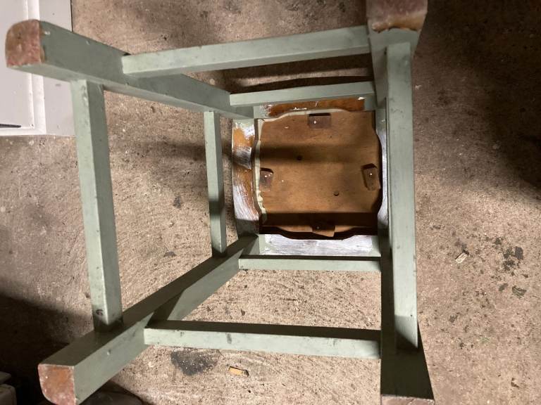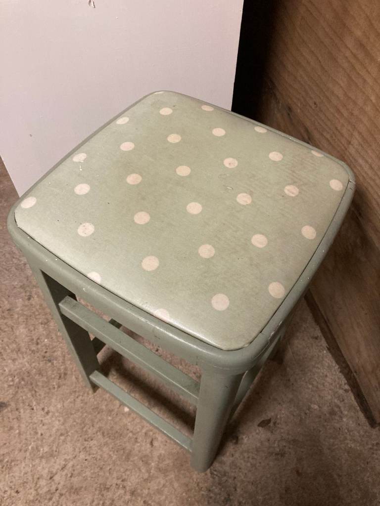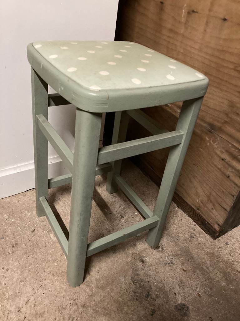 Vintage retro green spotted painted stool. Very solid and sturdy. Some flaky paintwork. Great edition to a country kitchen or for a retro home vibe. 34cm x 33cm x 57cm high.