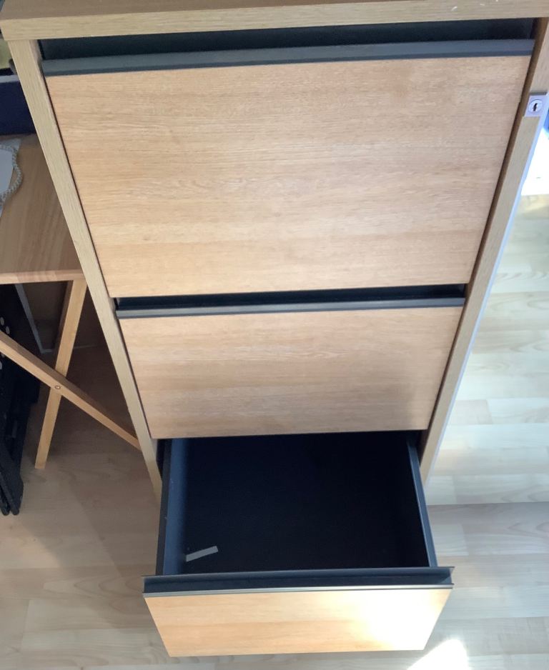 Wooden filing cabinet, 3 drawer, in very good used condition. Unfortunately the key is missing.
