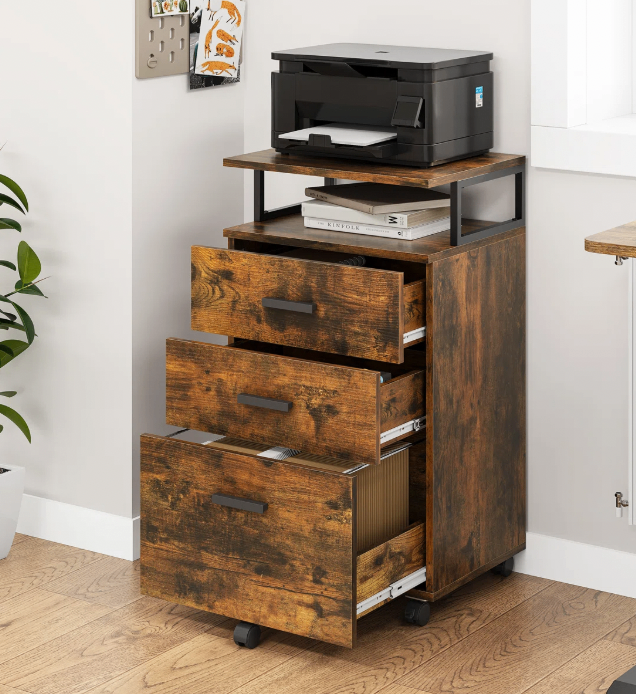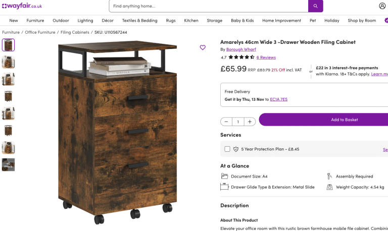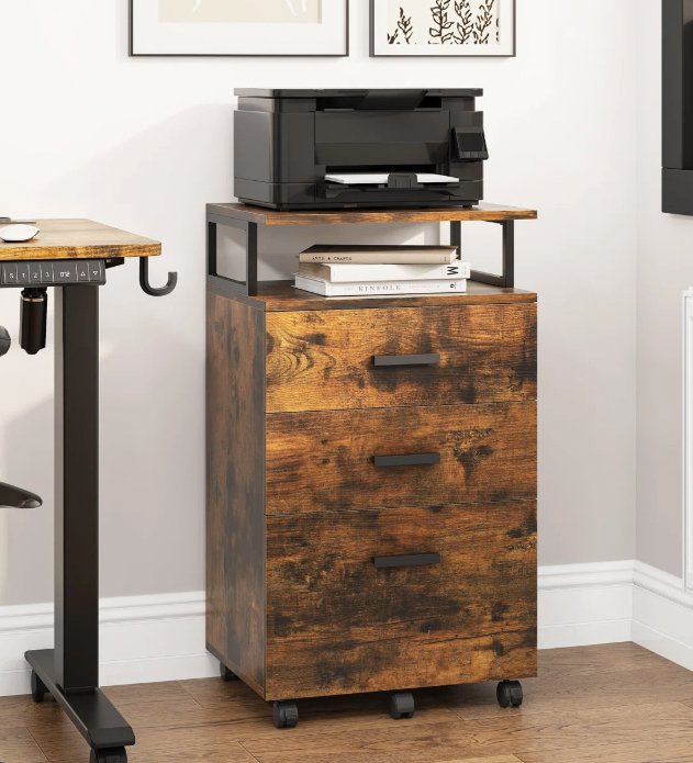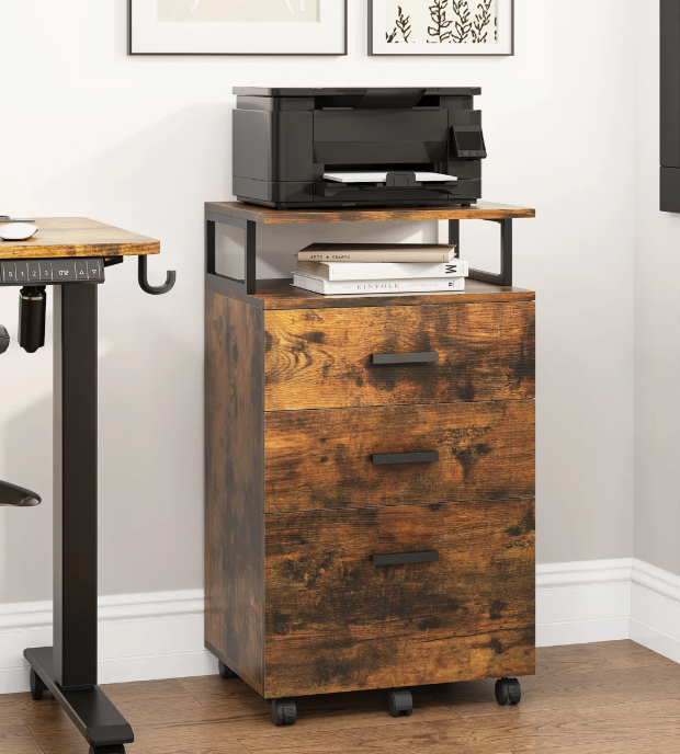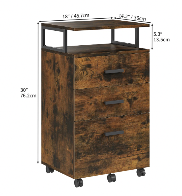 Selling an Amarelys 46cm wide 3-drawer wooden filing cabinet. This rustic brown farmhouse-style unit is brand new, still in its original packaging and never assembled. It has three drawers with metal slide glides, designed to fit A4-size documents, and includes a spacious top surface perfect for a printer or accessories. The cabinet is on wheels for easy movement and has a weight capacity of around 4.54 kg. I bought it at an auction but it’s too big for my space, so I’m reselling it unopened. I will leave it boxed and unbuilt until the buyer arrives. Open to offers.