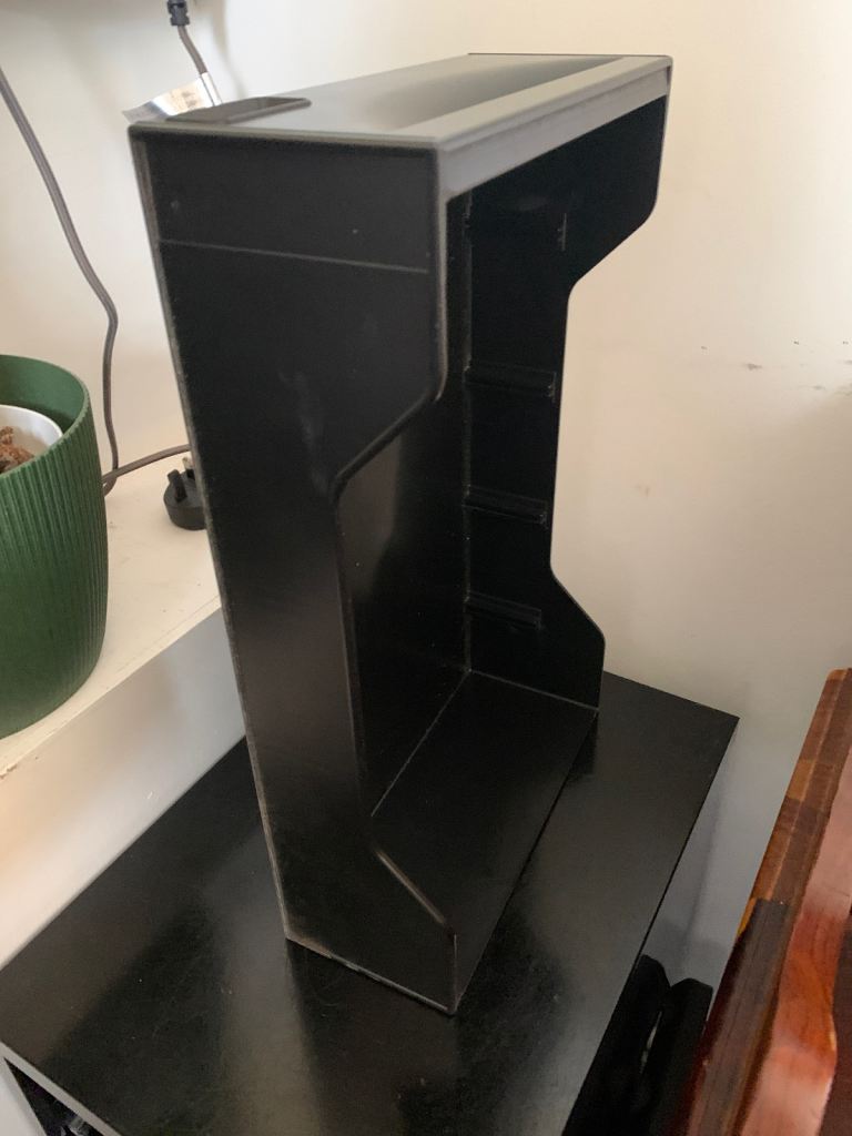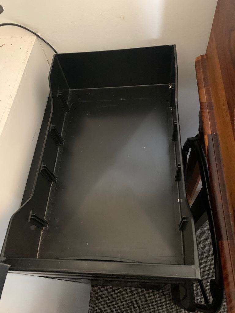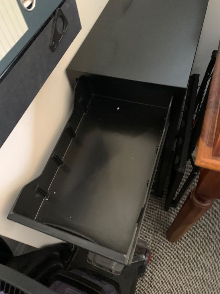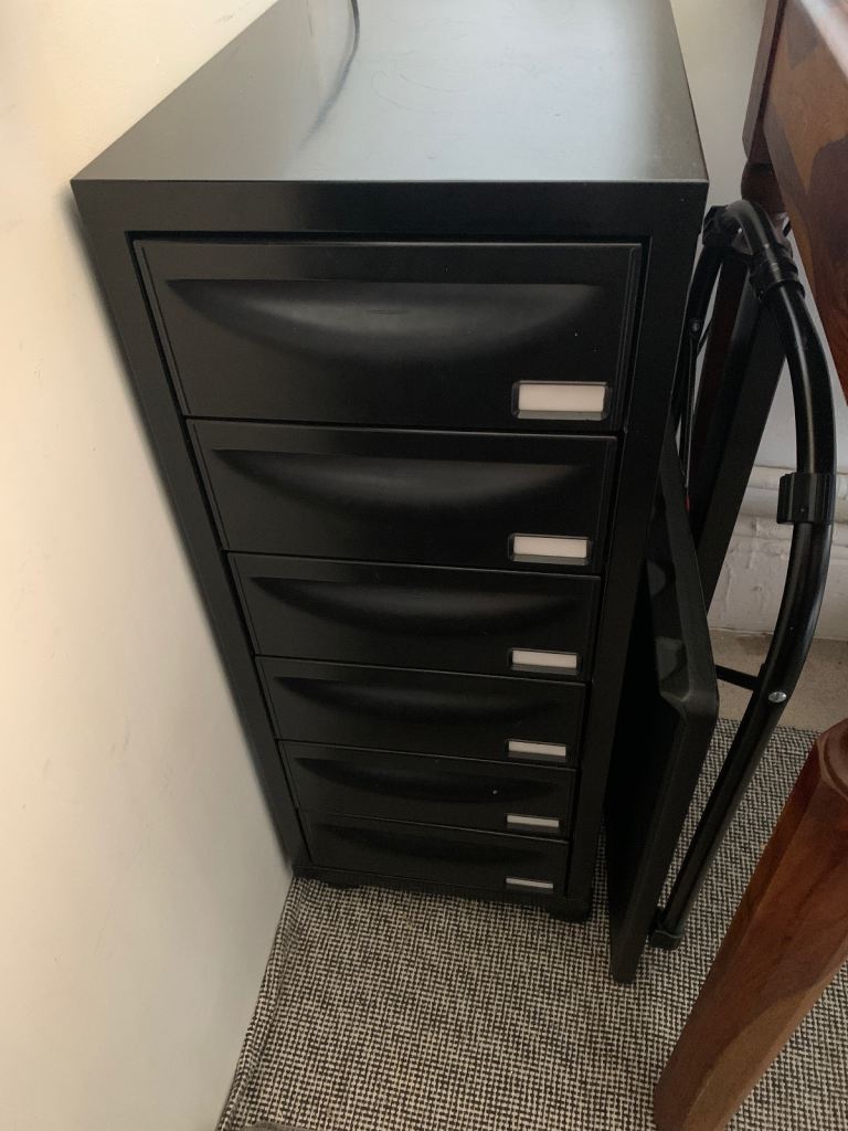 6 drawers made of plastic but black metal frame narrow slimline filling cabinet with wheels for easy moving . . Good condition. Lightweight . Few scratches here and there . Carries good load in each draw no lock or key