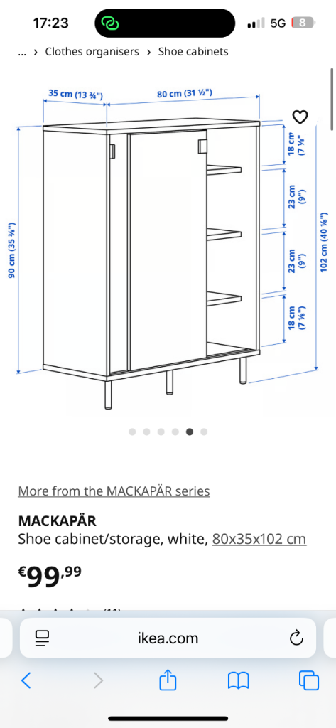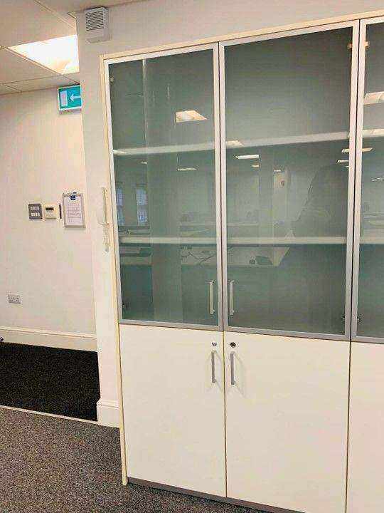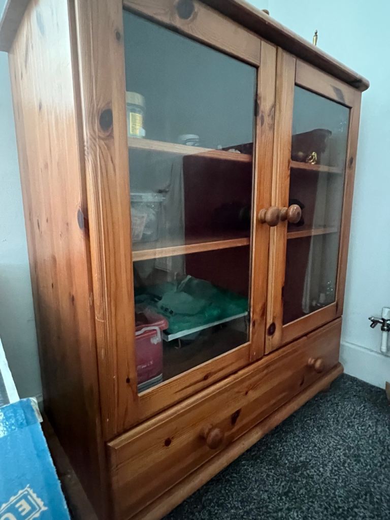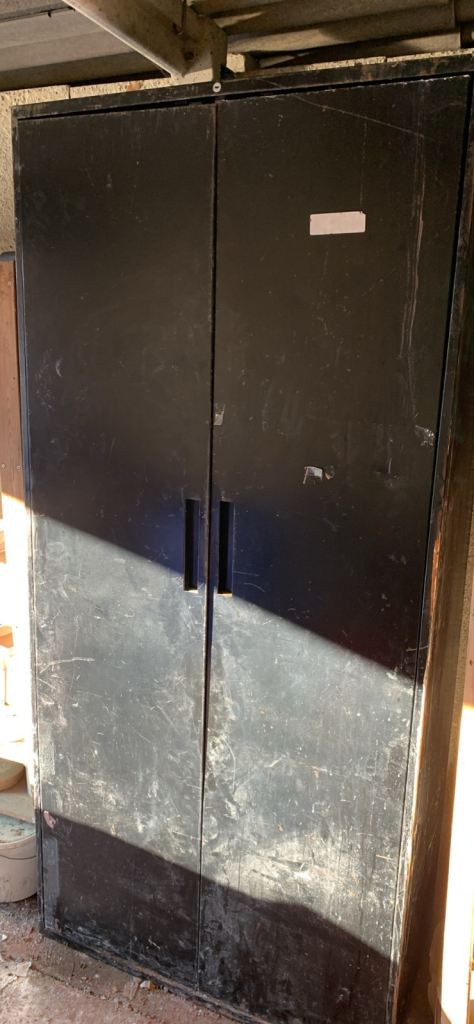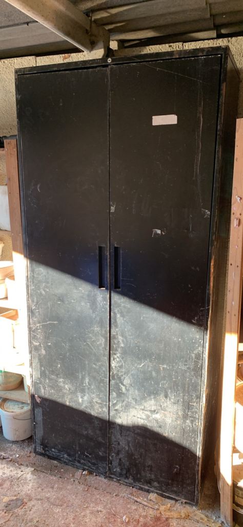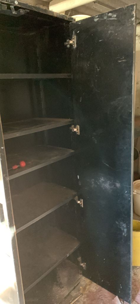 A very solid cabinet with two doors, and four adjustable shelves. In good condition, although it needs to be wiped down.
