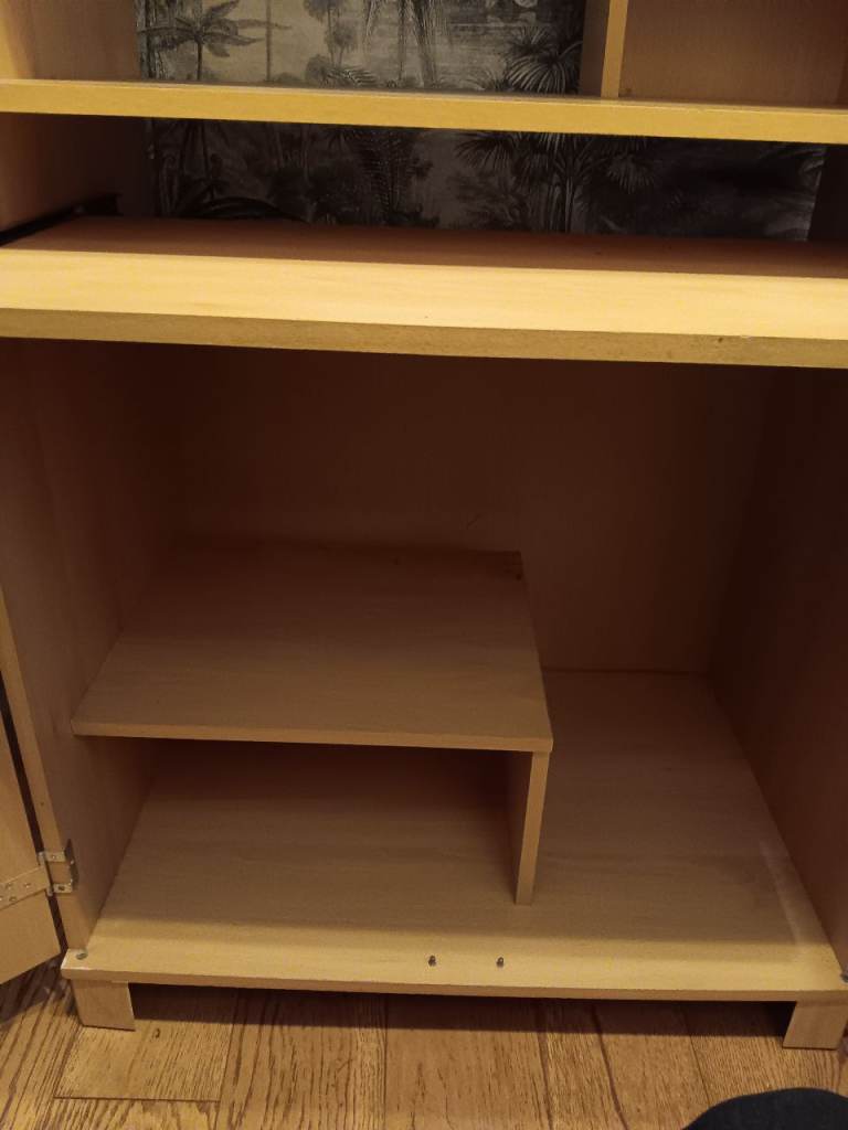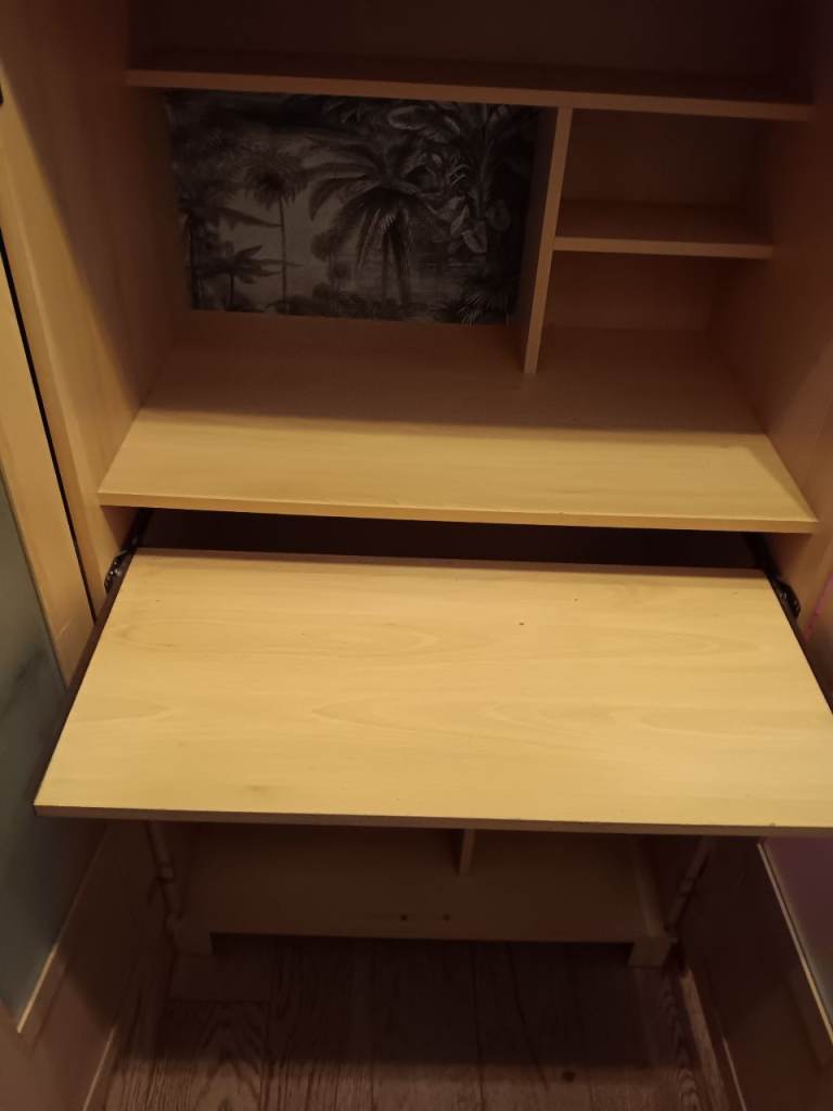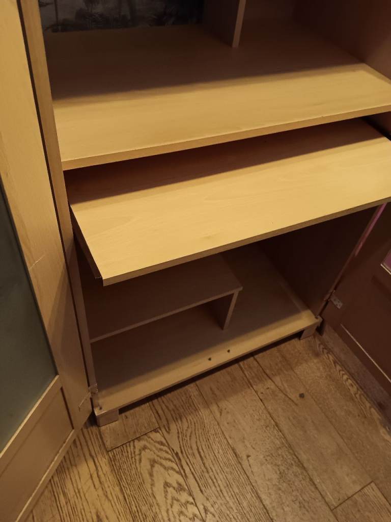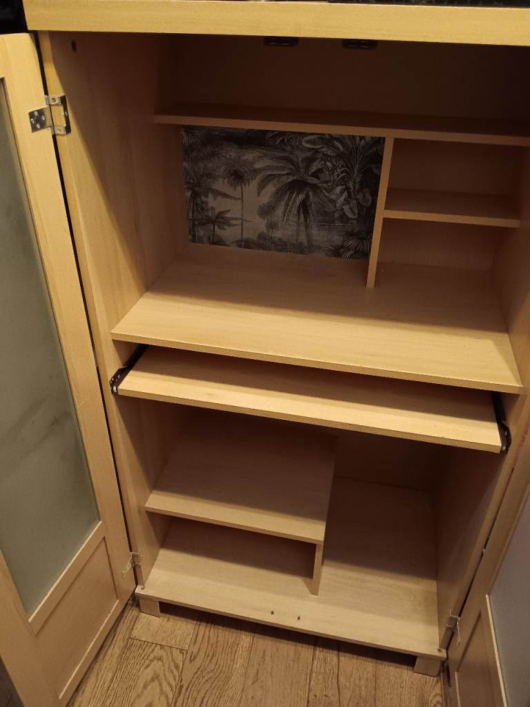 Pine computer cabinet with glass doors.