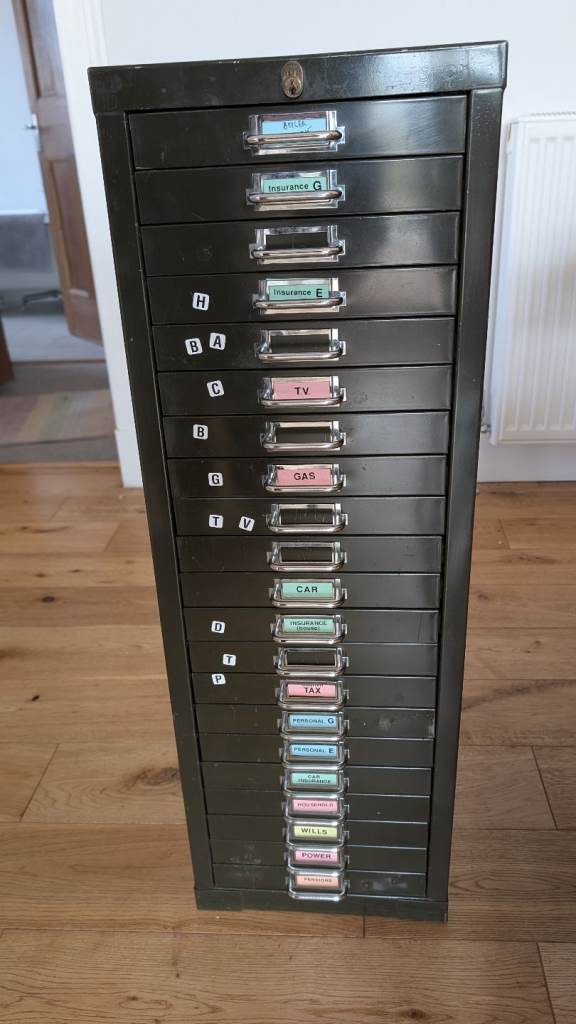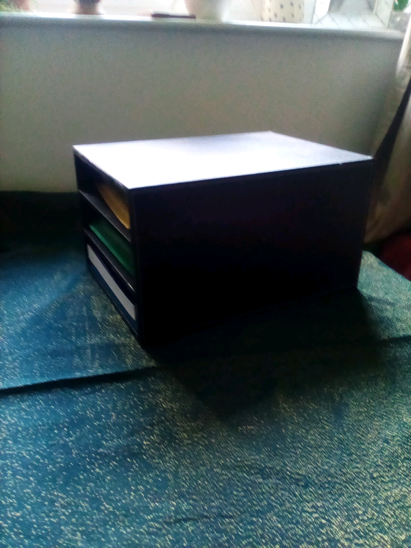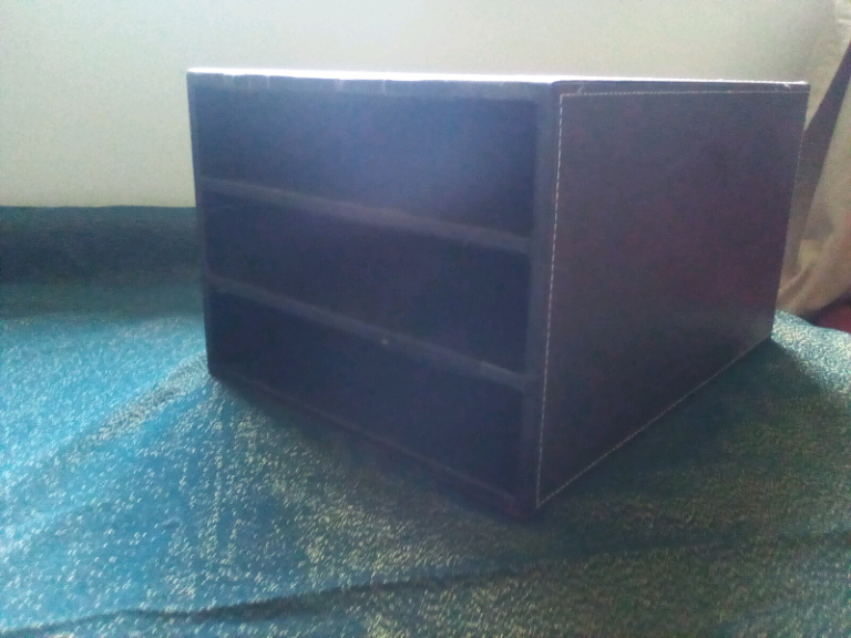 Faux leather 3 tier shelf/ letter tray/storage. Very solid. Very useful item. We're only selling, as we no longer have a home office. Large enough to take A4 & Foolscap or magazines etc.