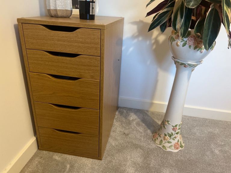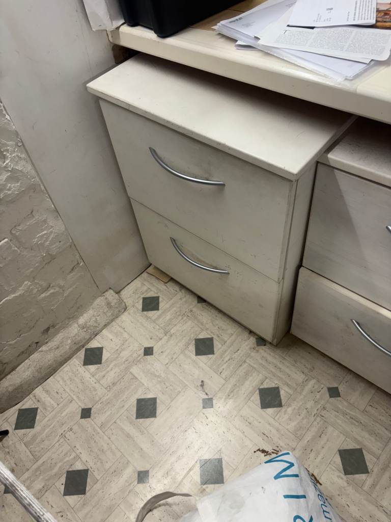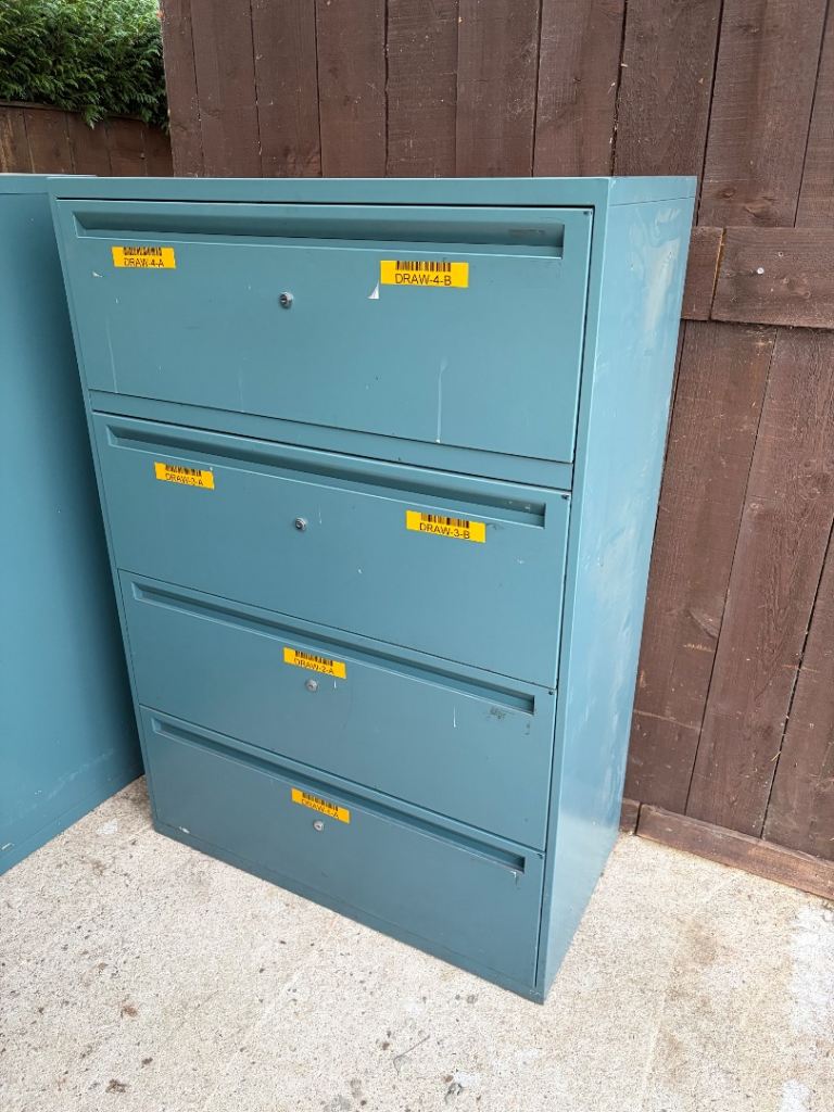 Metal filing cabinets, comes on wheels so easy to move, can add a camlock to lock these securely.