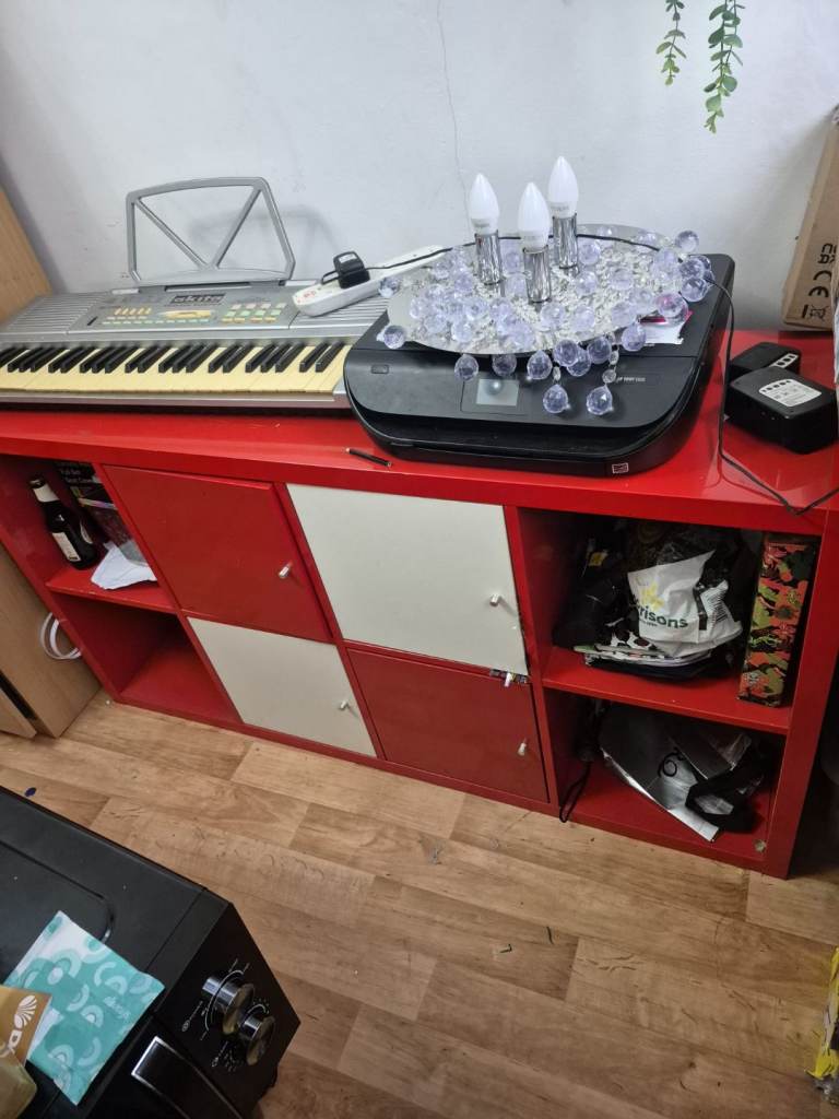 Red and white storage cabinet for sale.
