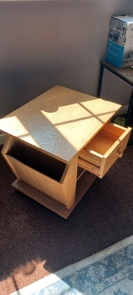 Perfect condition table with drawer, magazine holders and shelves inside. Perfect for storage and putting coasters and drinks on. 50cm wide x x 40cm deep x 49cm high. Light oak colour.