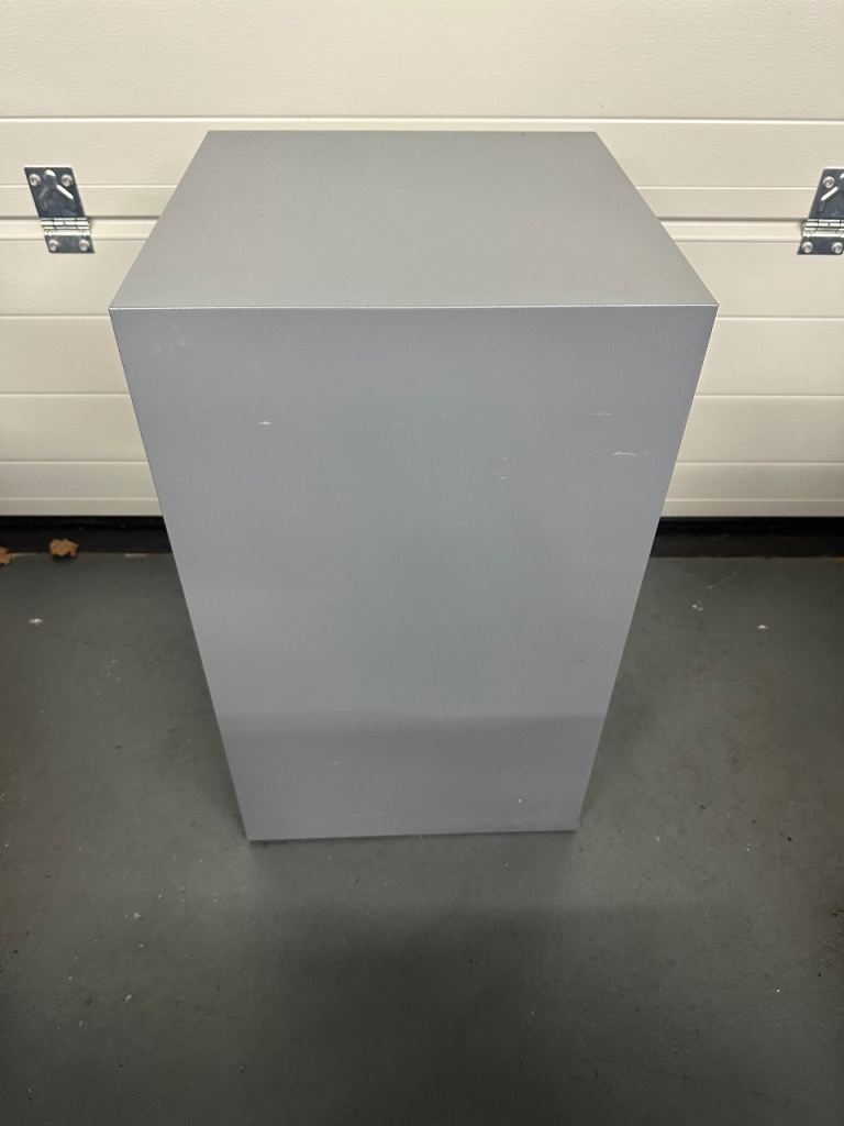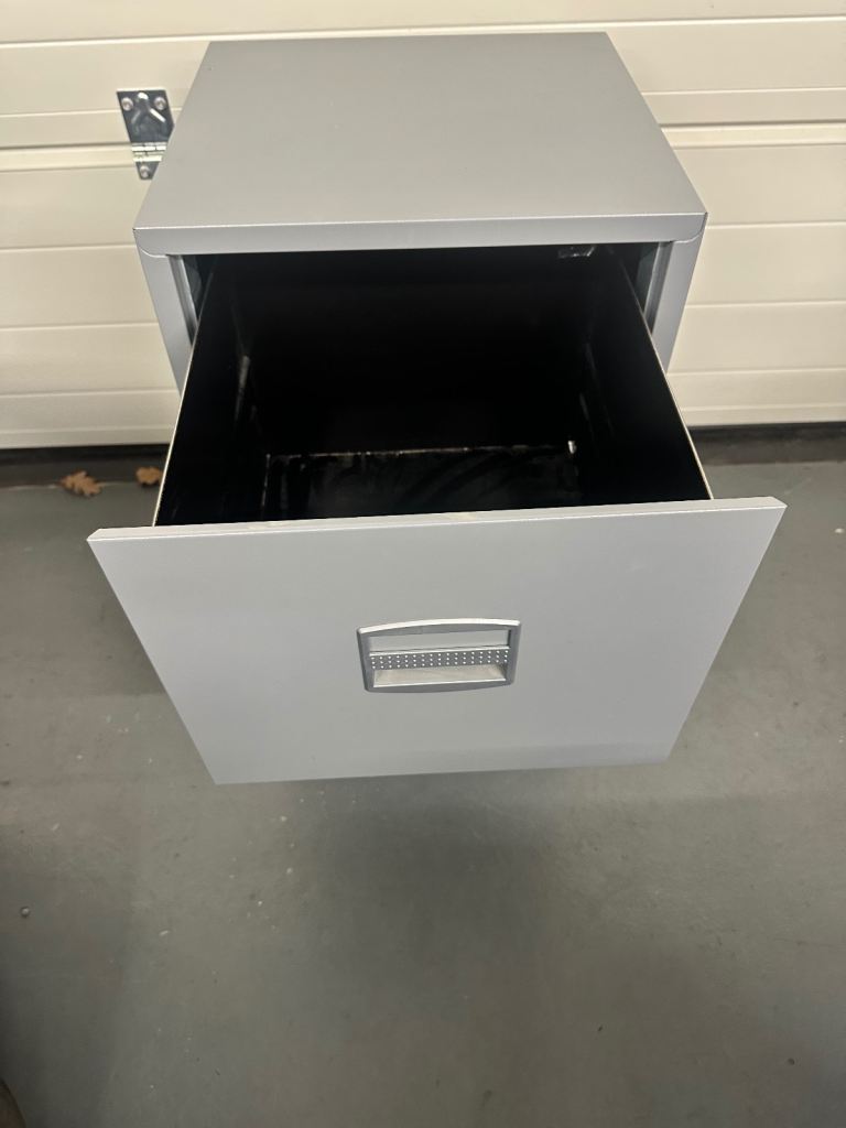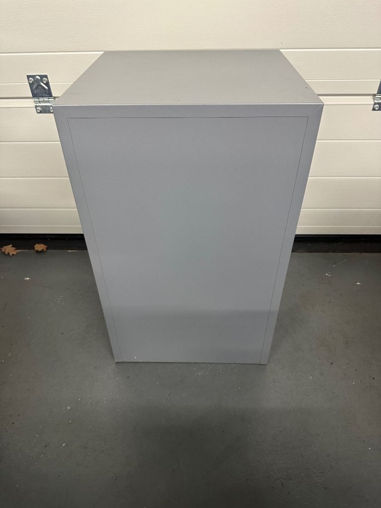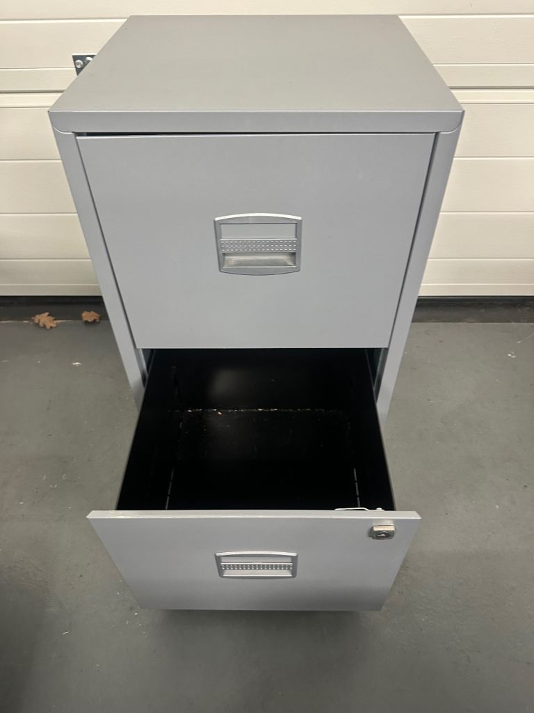 Two drawer grey metal filing cabinet. 41cm wide x 40cm deep x 67cm tall. Ideal for home office.