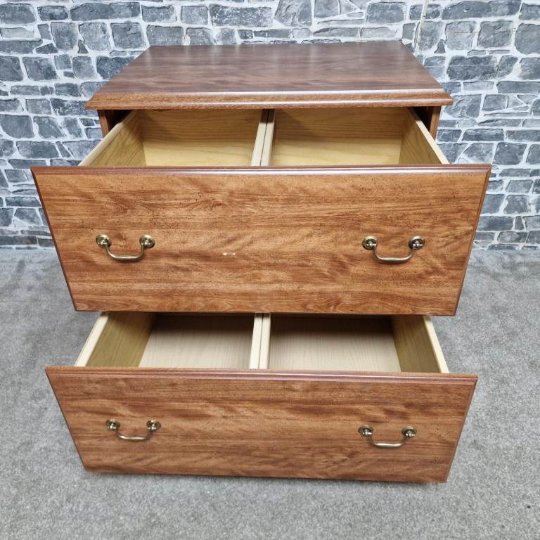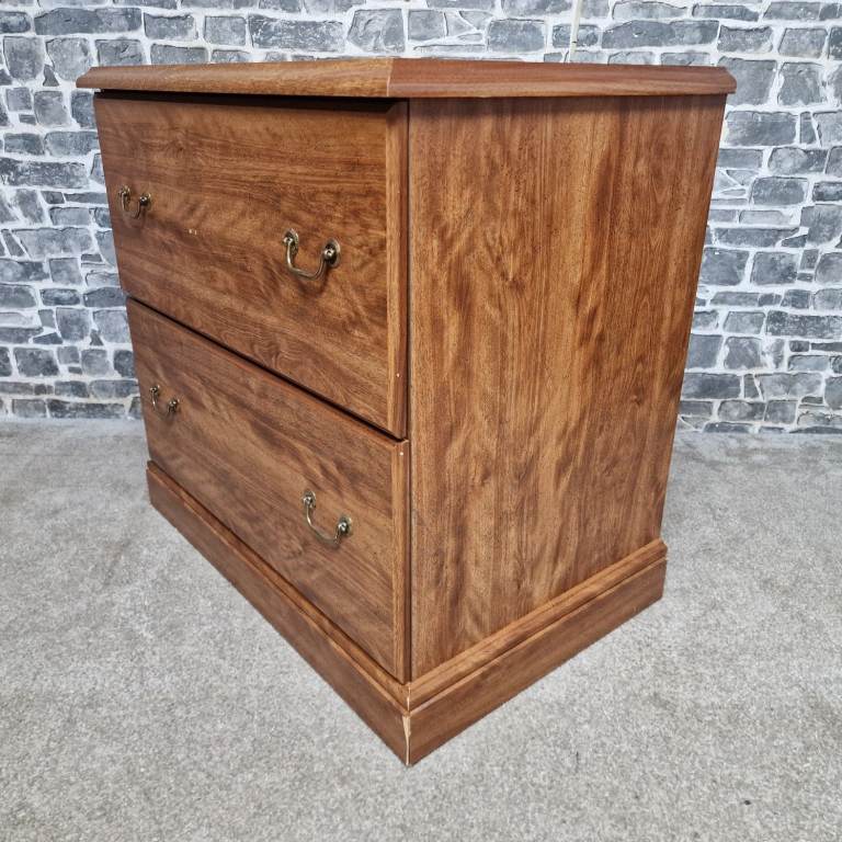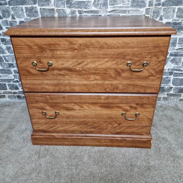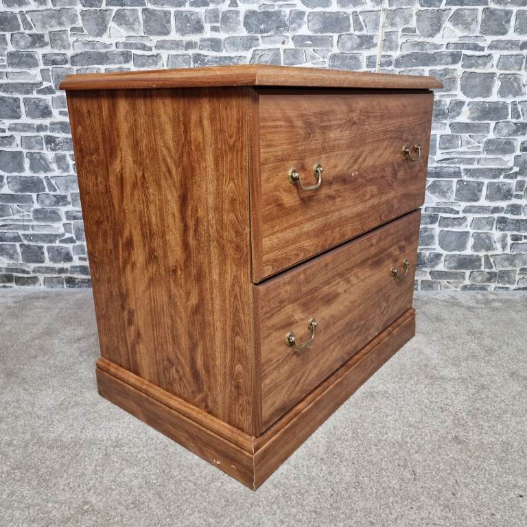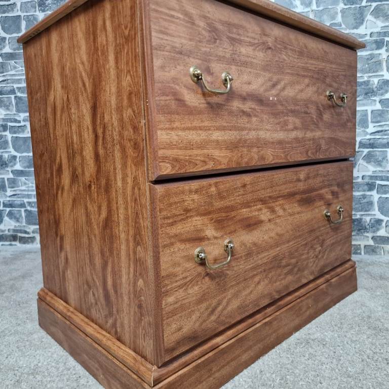 Solid and practical vintage filing cabinet with attractive wood veneer finish and brass style drop handles. Features two extra deep drawers, ideal for storing suspension files, paperwork or general office storage.
