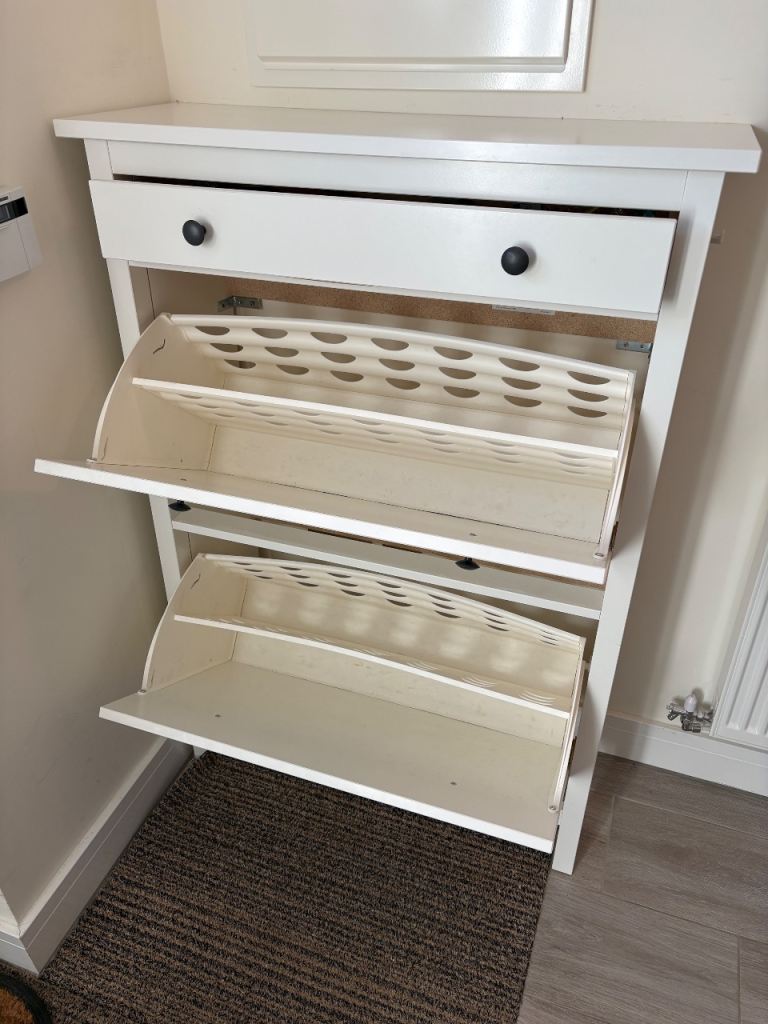 White shoe storage cabinet in good condition, perfect for keeping your hallway tidy and organised.