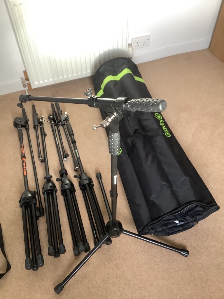 We have for sale 5 microphone stands with a Gravity travel bag in excellent condition and great for stage or studio. Also included are 2 further stands which are well used but are really good, sturdy quality stands.