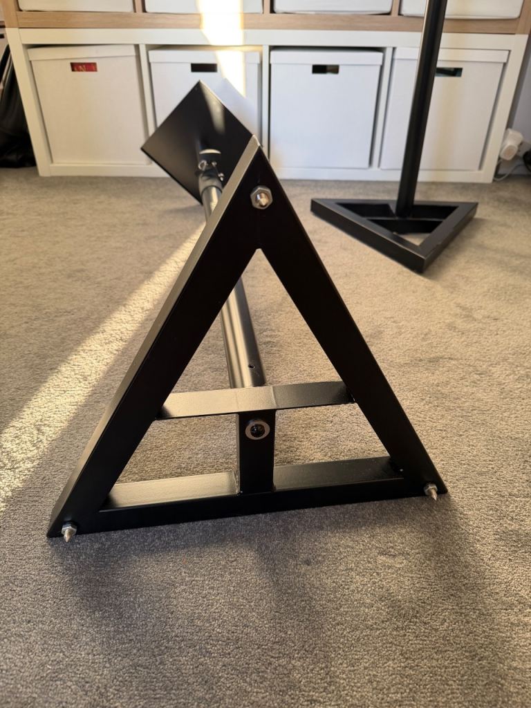 Sturdy and heavy duty metal stands with safety pin lock to change height. Rotating 360 degrees and able to support up to 35kg each.