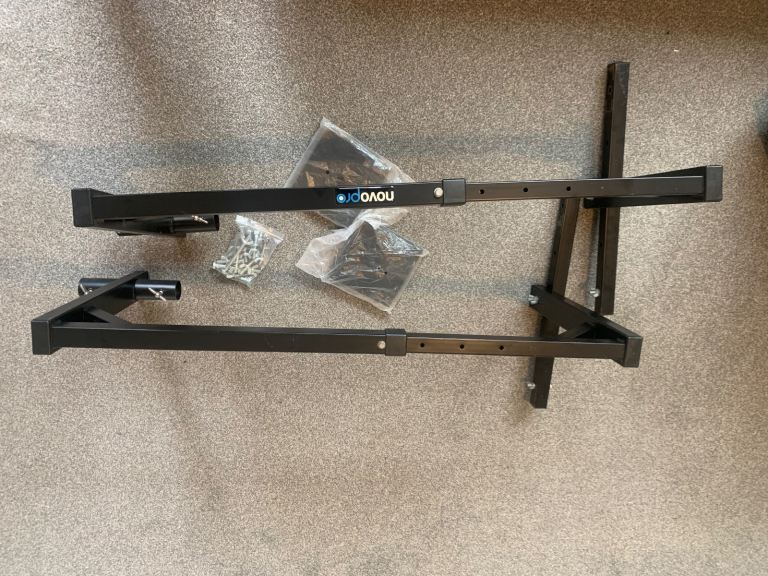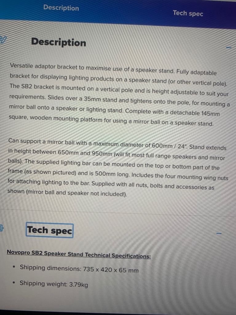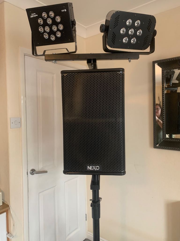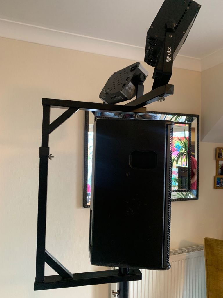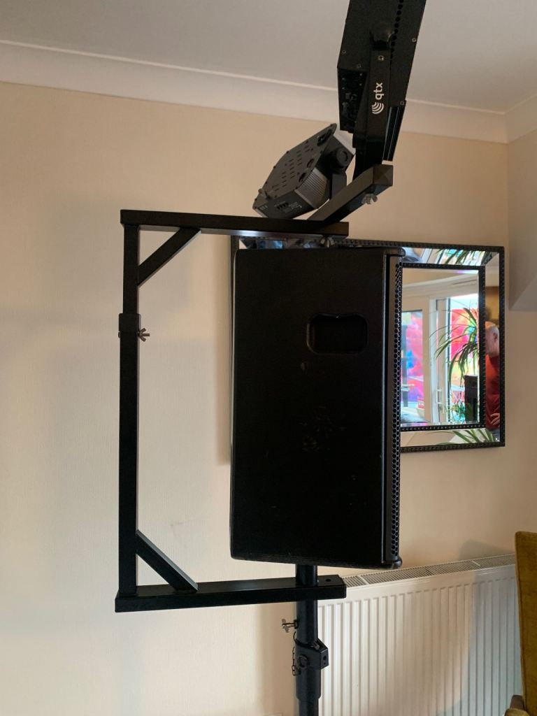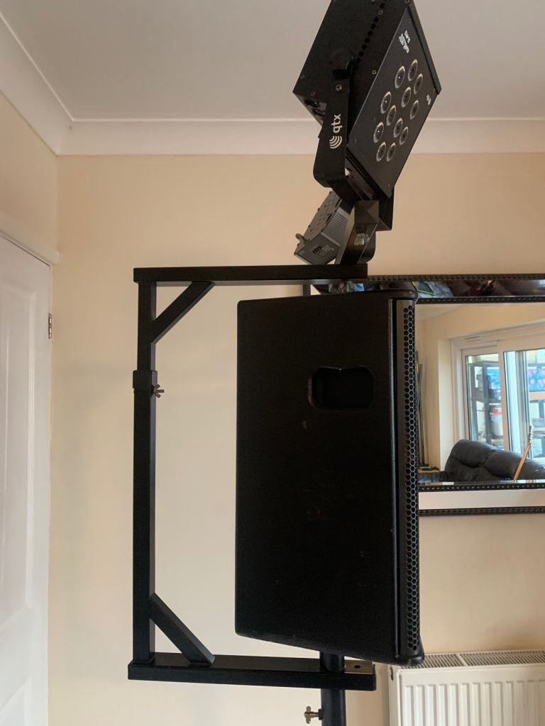 A multi functional speaker stand add-on for hanging your lighting above your speakers and saving floor space. Can be configured in different ways to suit your use. Comes with two wooden blocks to use with mirror balls and a bag of various bolts.