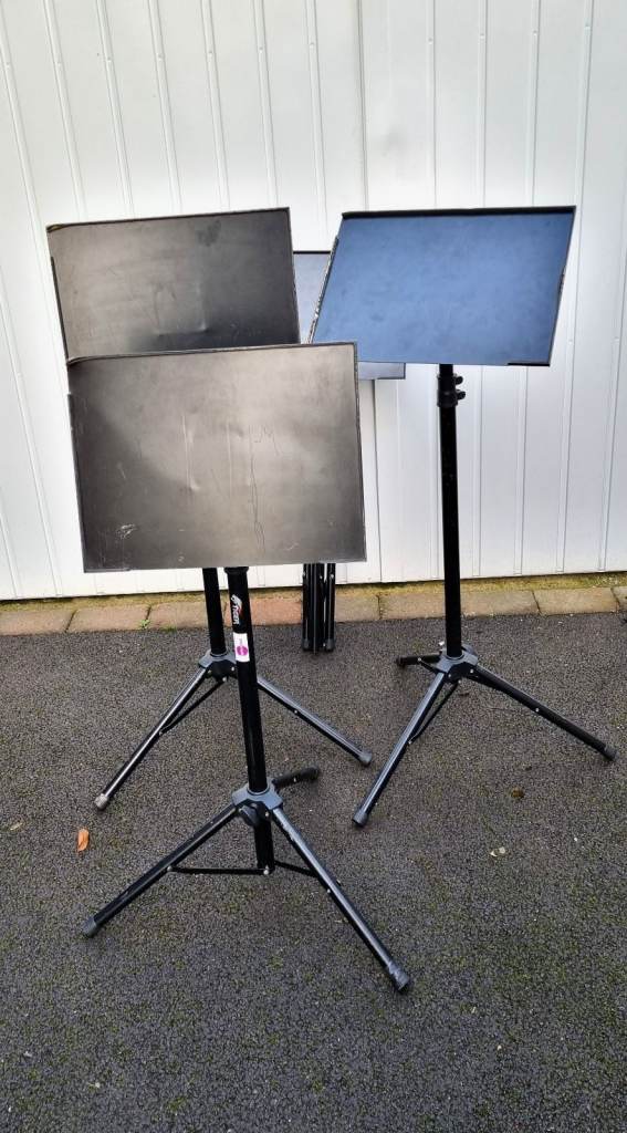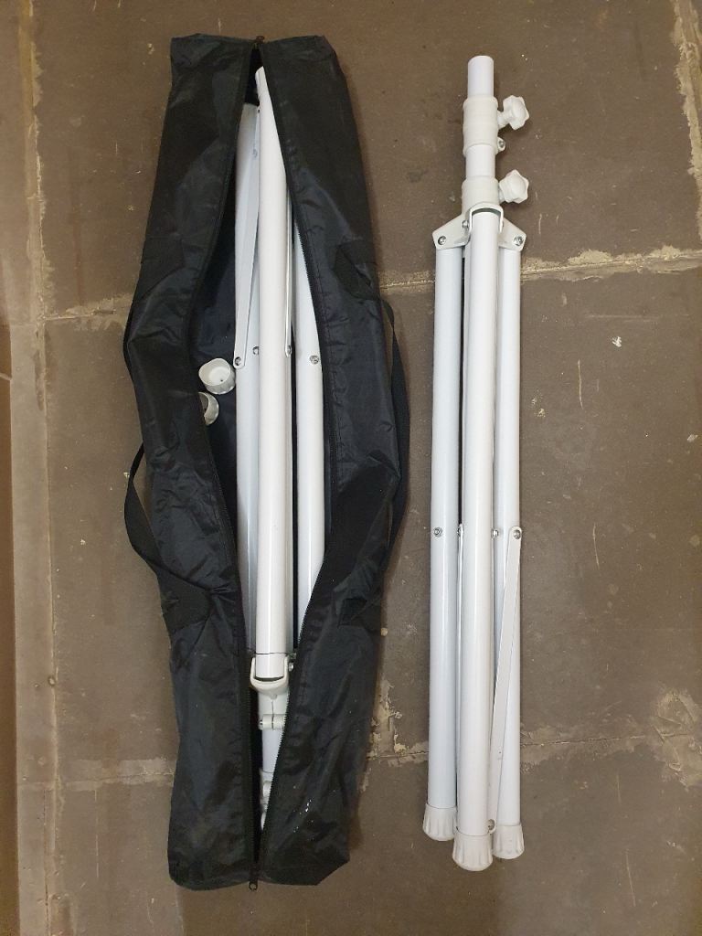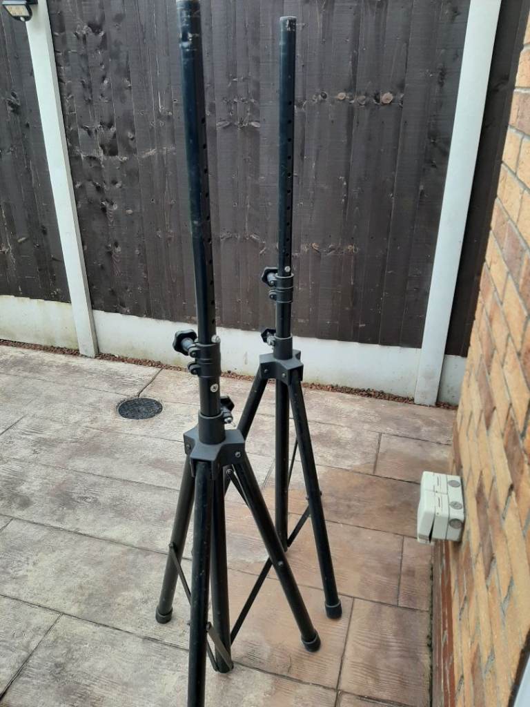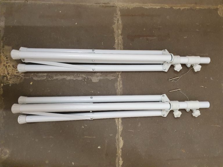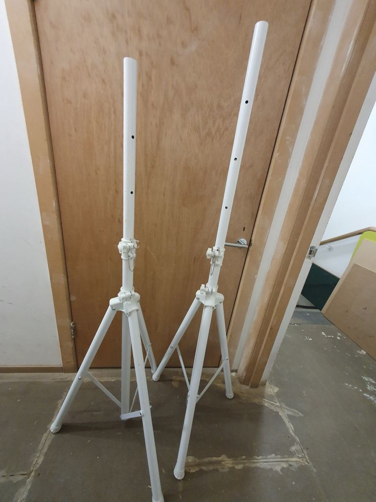 Pair of speaker stands for sale. White metal, adjustable, in bag.