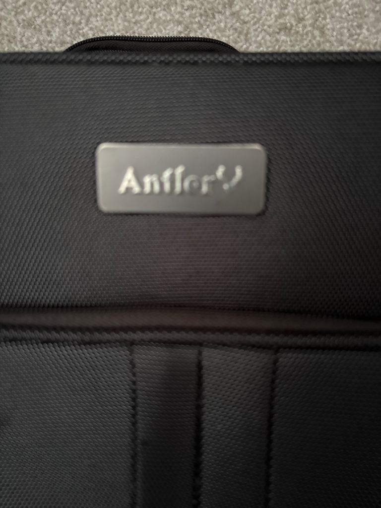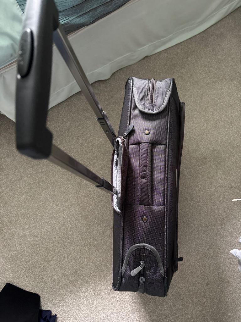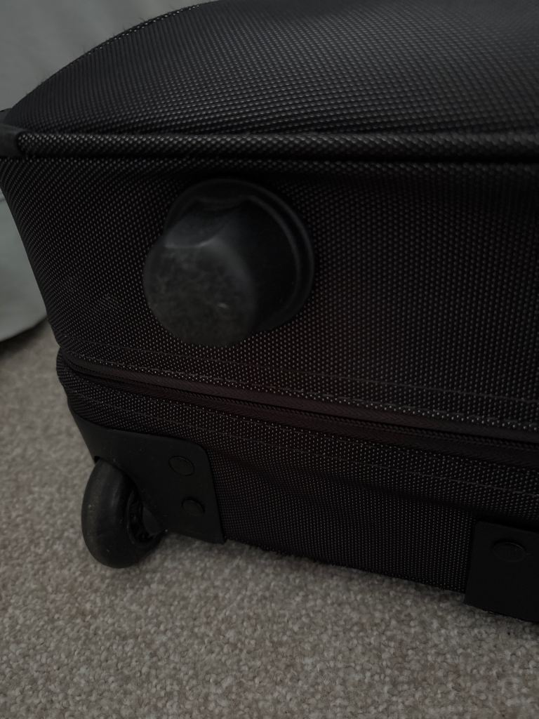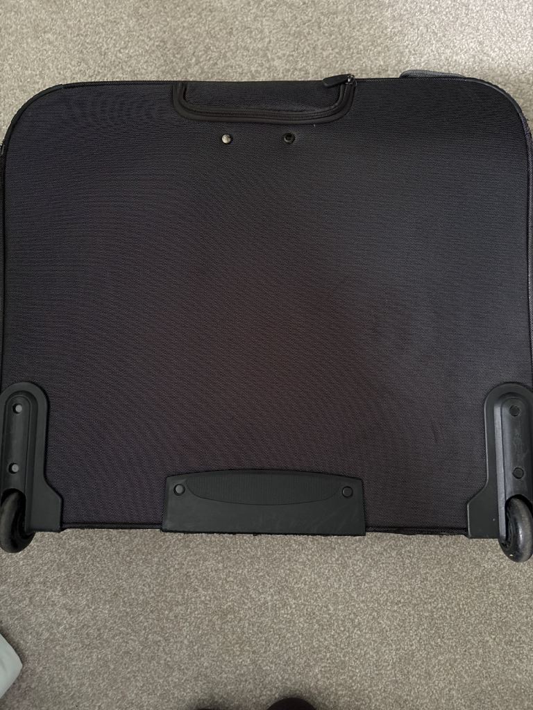 Black versatile case on wheels and with pull-up handle. It hasn’t had much use so is in very good condition apart from very minor scuffs. Comes with coat hangers attached inside