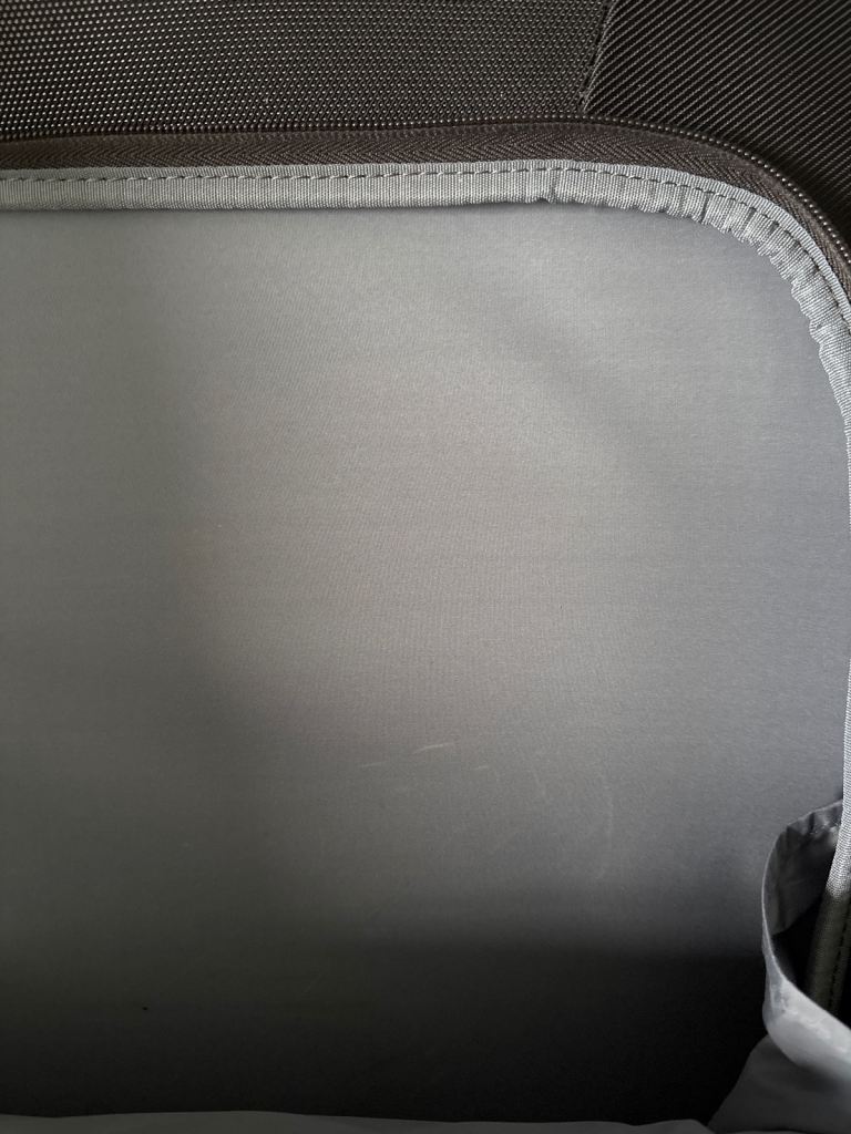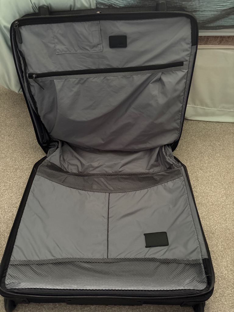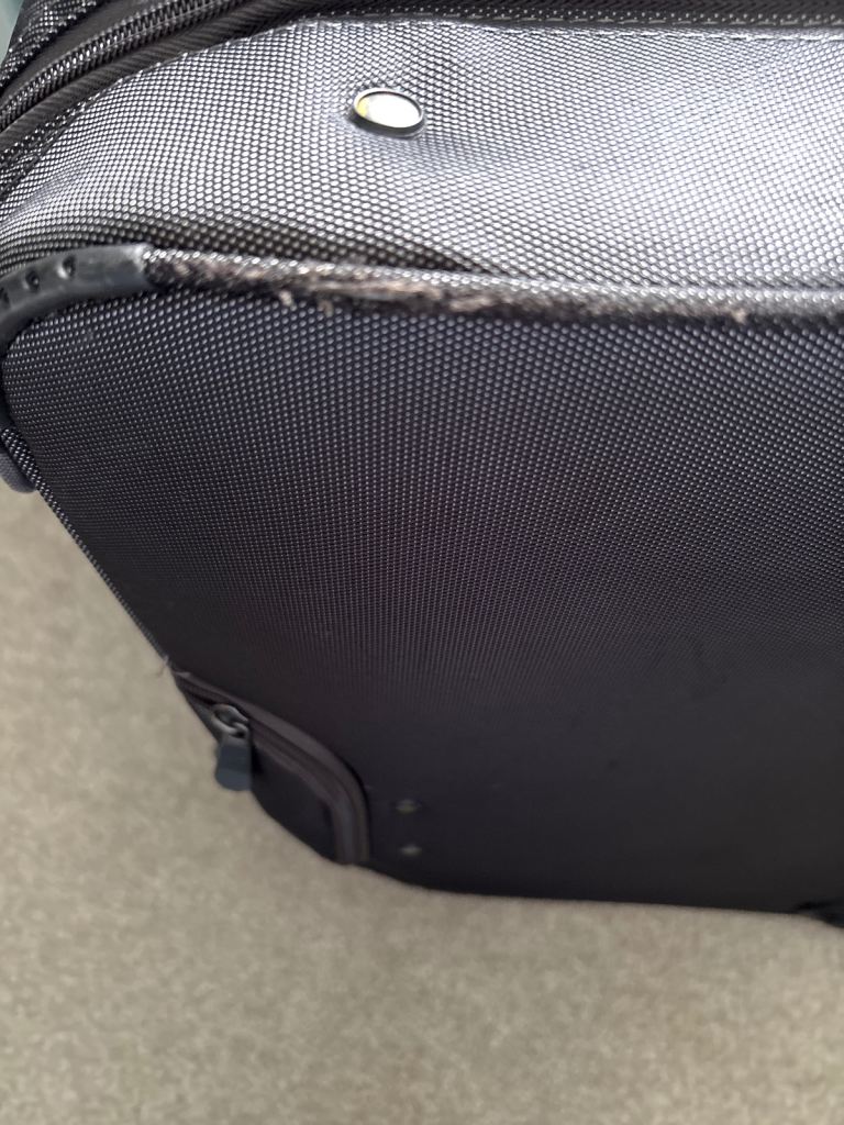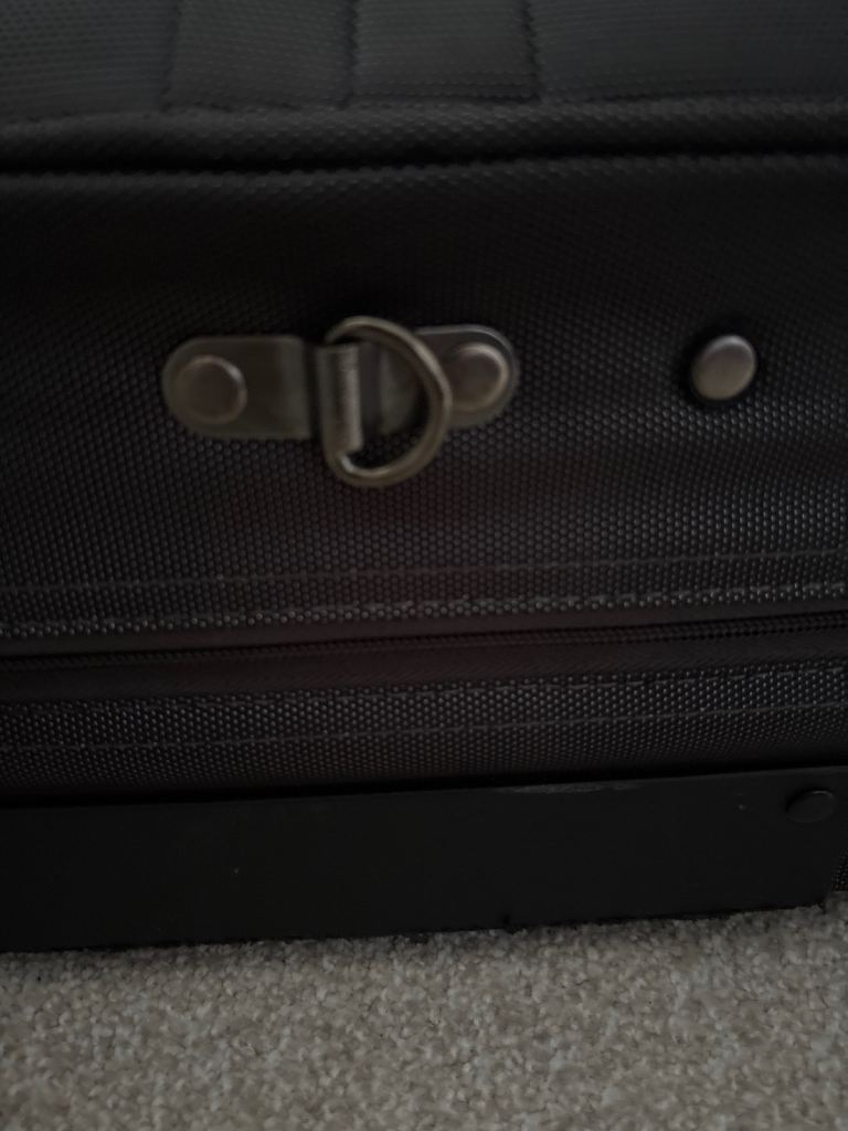 Black versatile case on wheels and with pull-up handle. It hasn’t had much use so is in very good condition apart from very minor scuffs. Comes with coat hangers attached inside