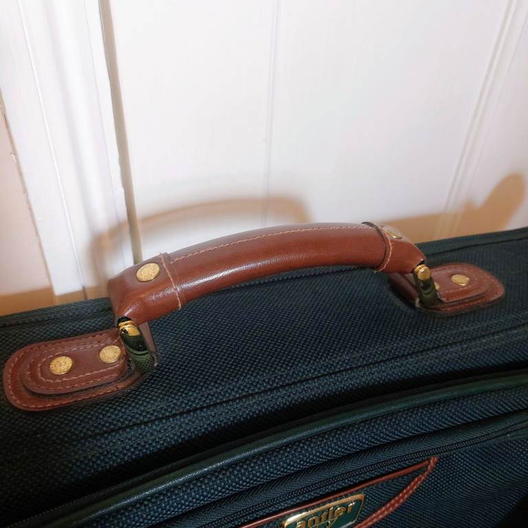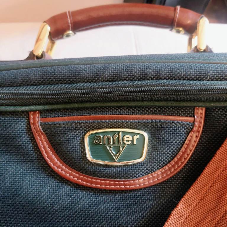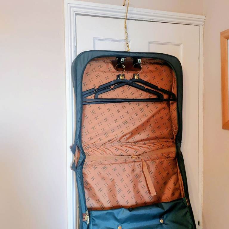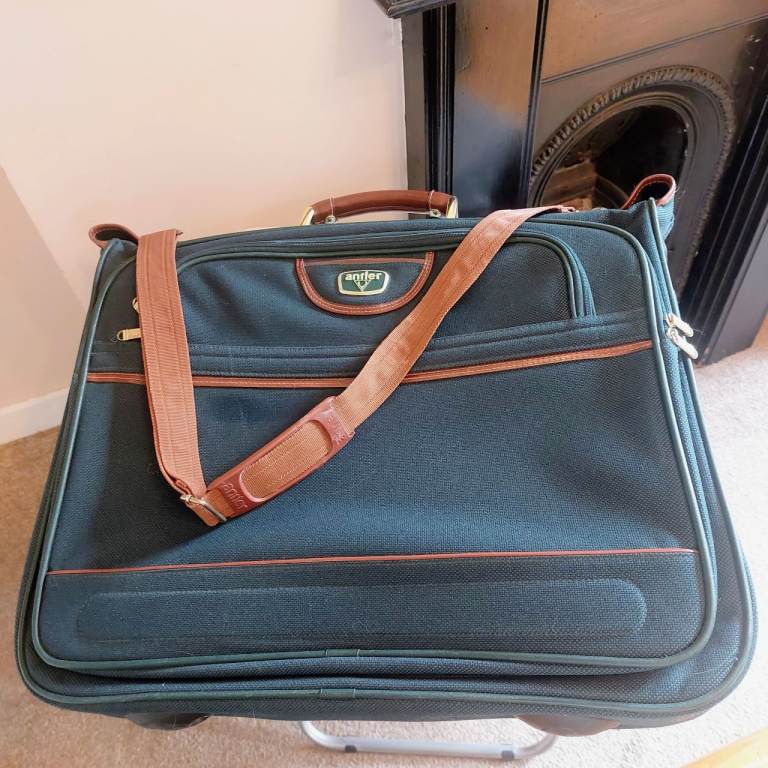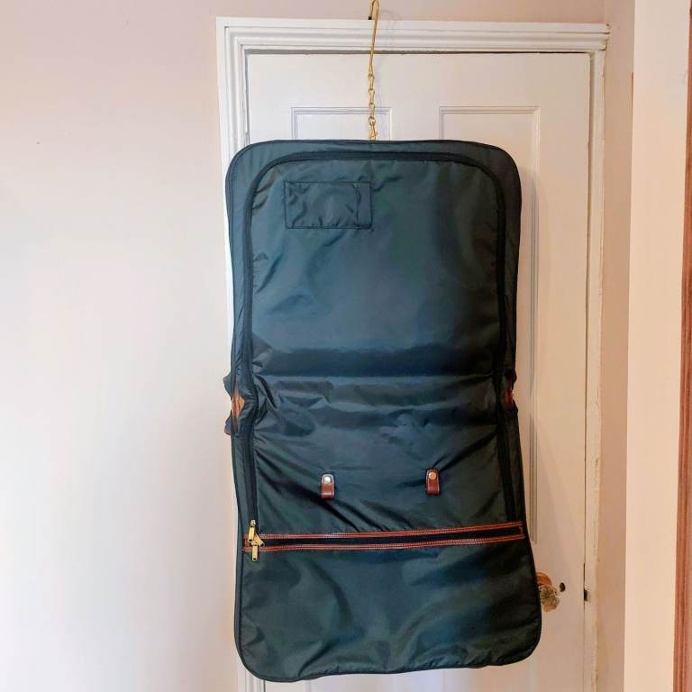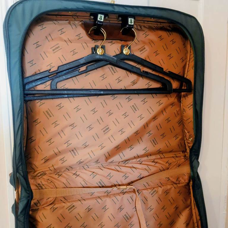 Lots of additional pockets, coat hangers inside, brown leather carry handle and shoulder strap