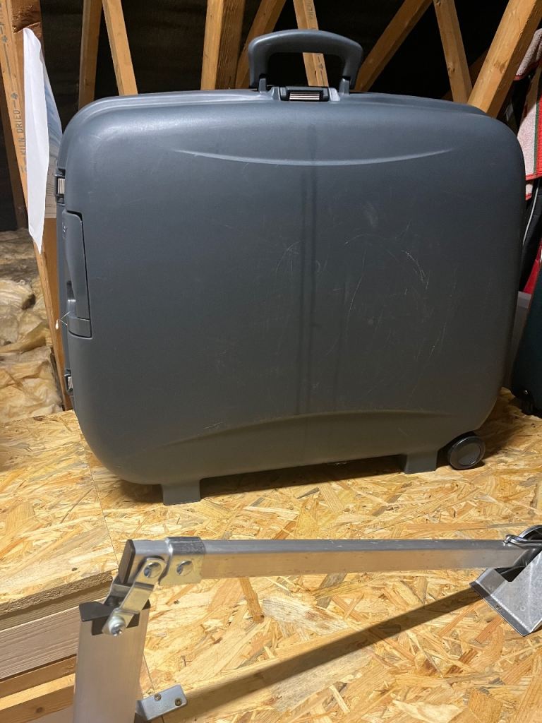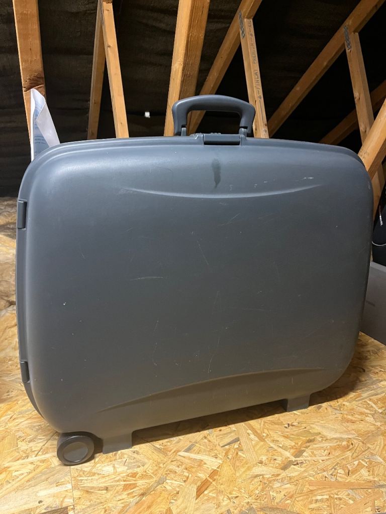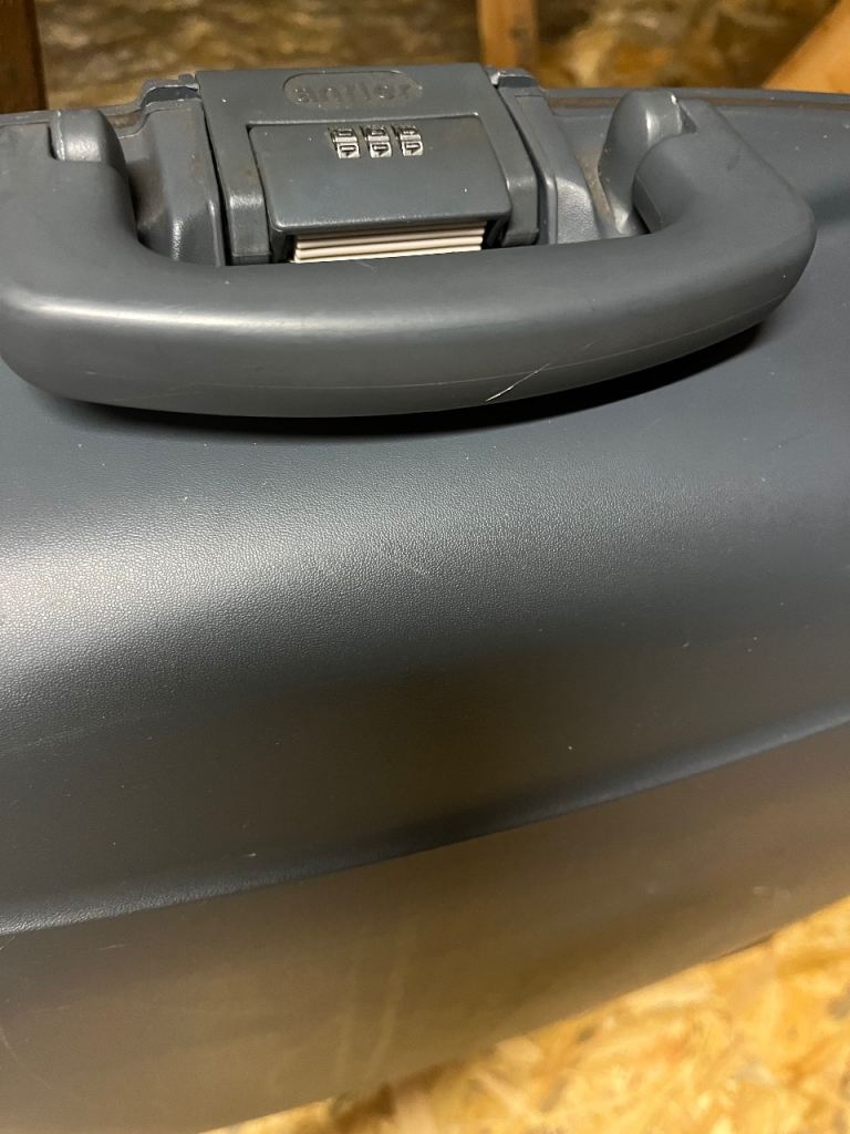 Grey, hard shell Antler suitcase with combination lock. Rear wheels and pulling handle.