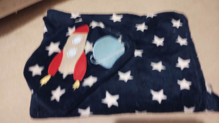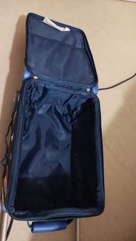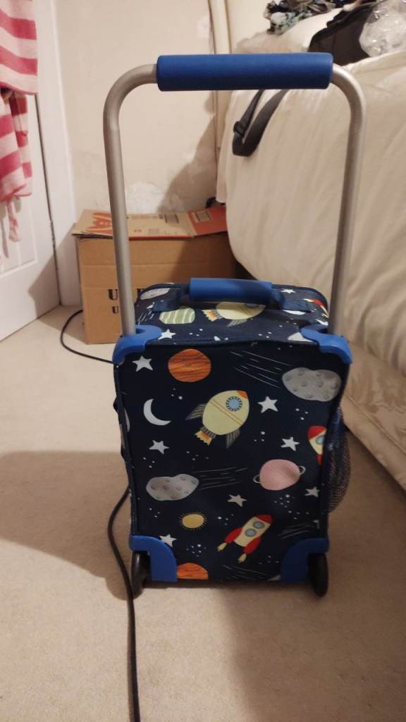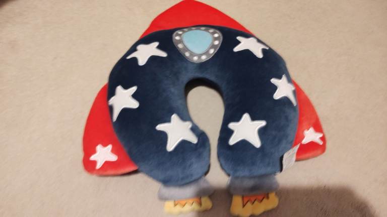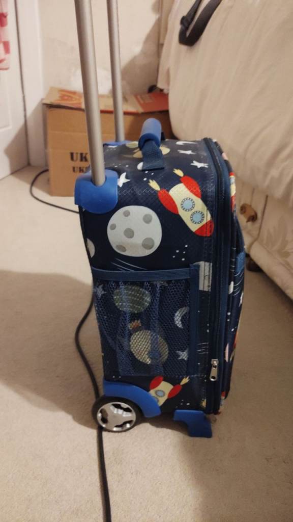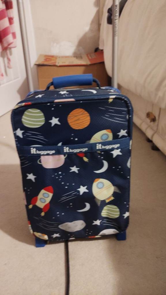 It space child's pull along suitcase with front and side pocket. Matching pillow and blanket available.