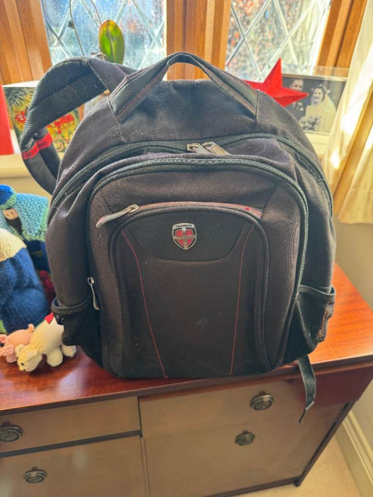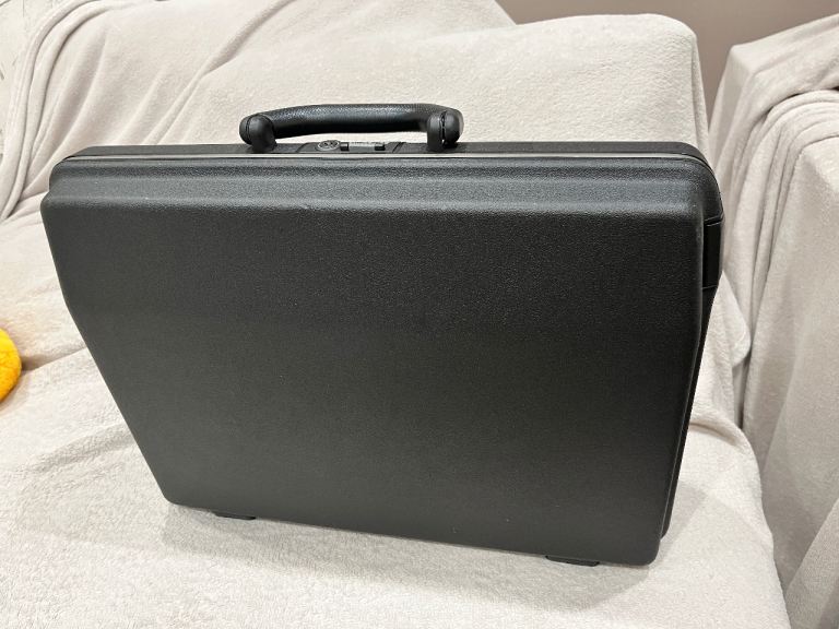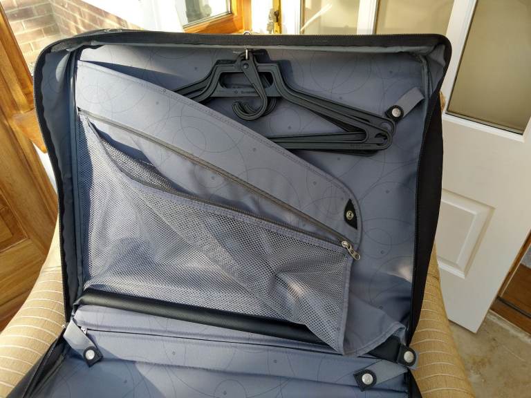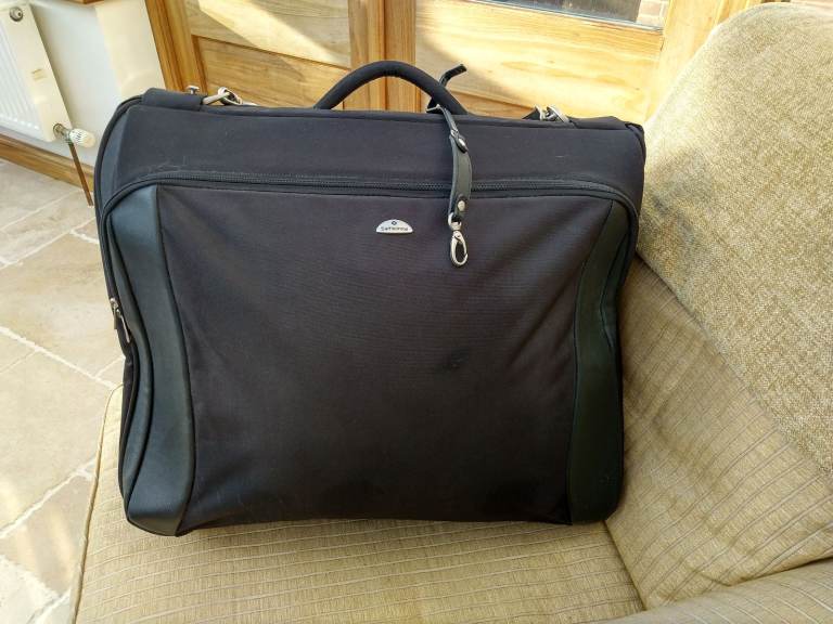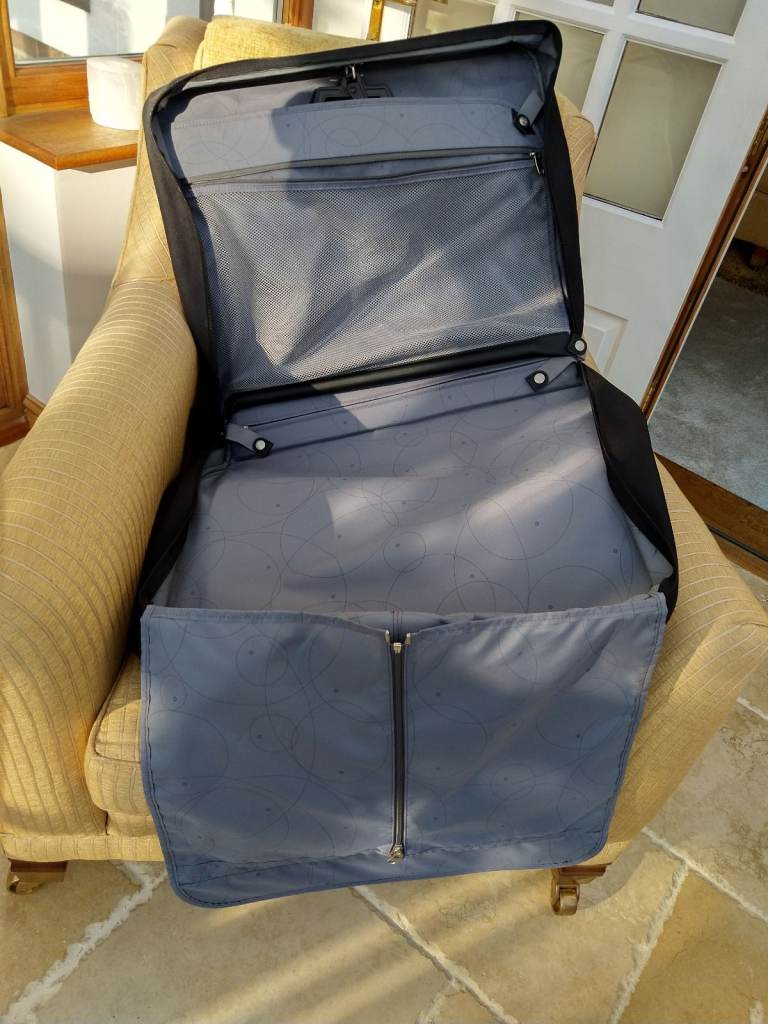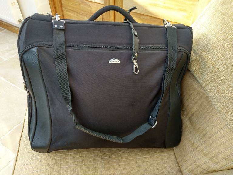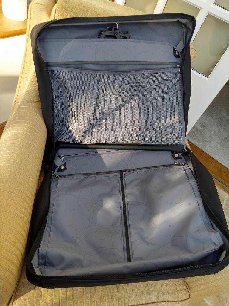 Black Samsonite quality garment carrier in perfect clean condition, seldom used and no longer needed. Comes with 3 removable hangers, and also a hook/strap for hanging the case up with the garments still in it. Separate zipped compartments front and back, with internal compartments for shoes, etc.