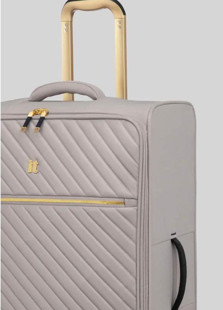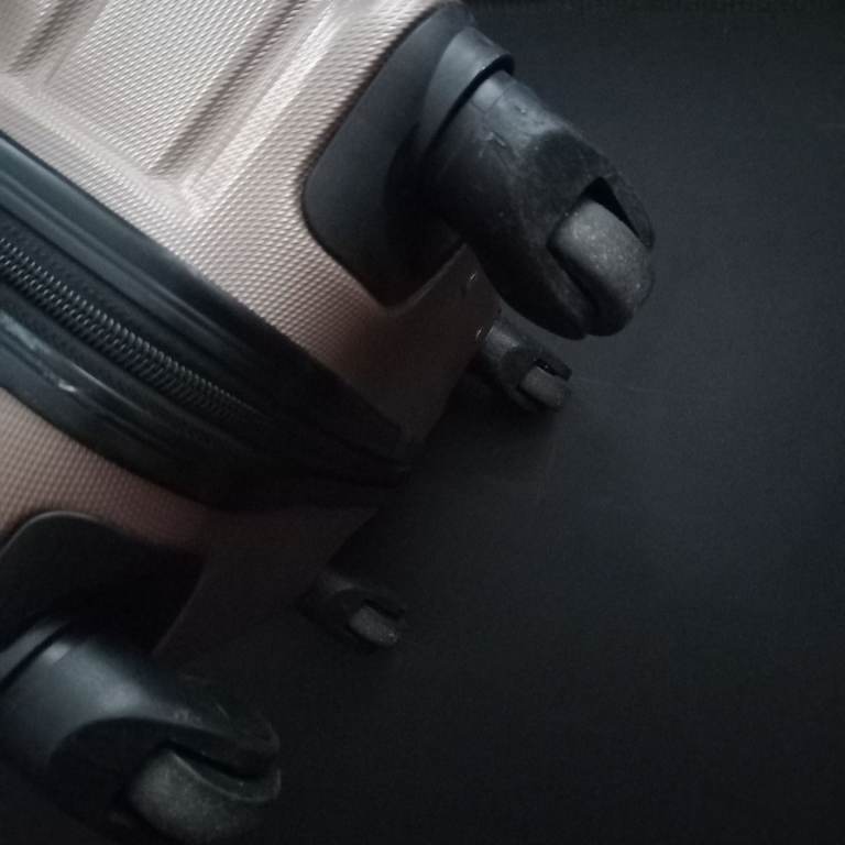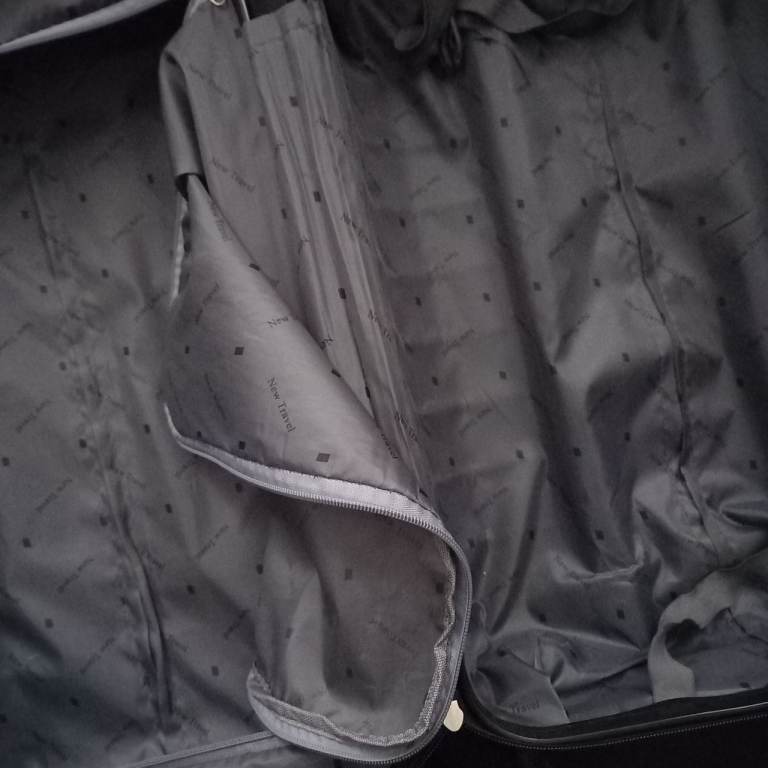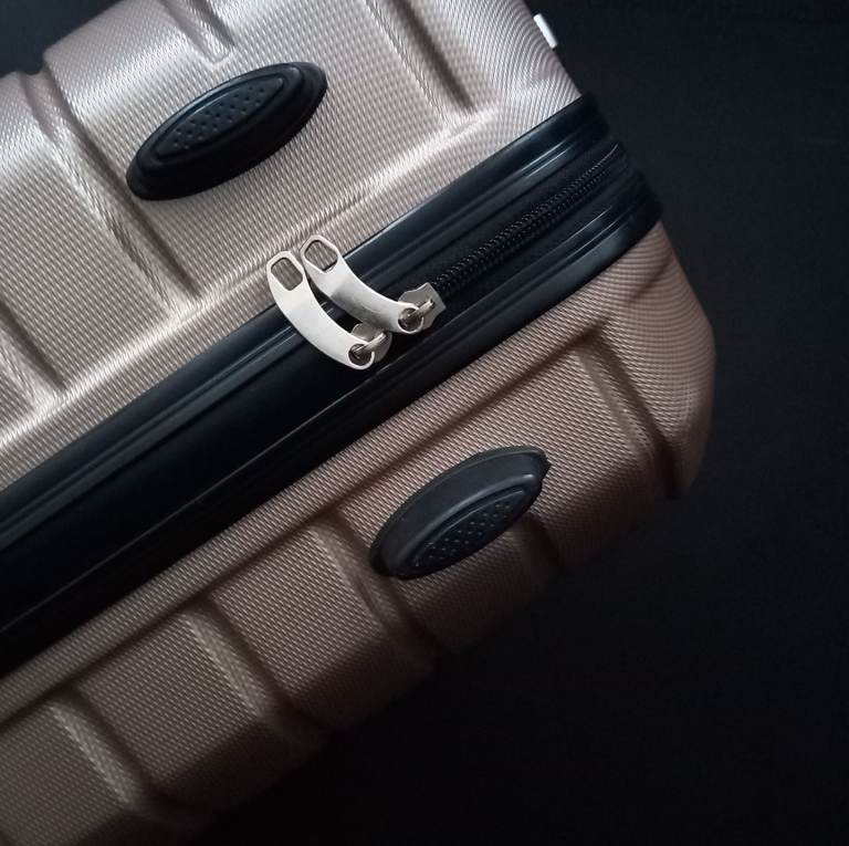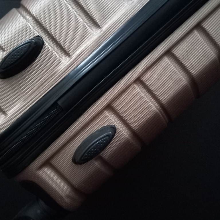 Wheeled hardback case, extendible handle, double external zip, 4 thick feet to open standing on side, carry strap handle, internal zip department divider and content strap holder.