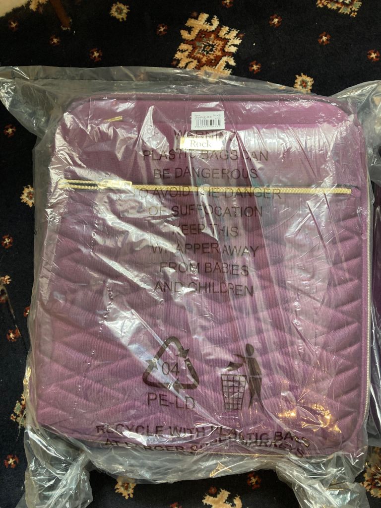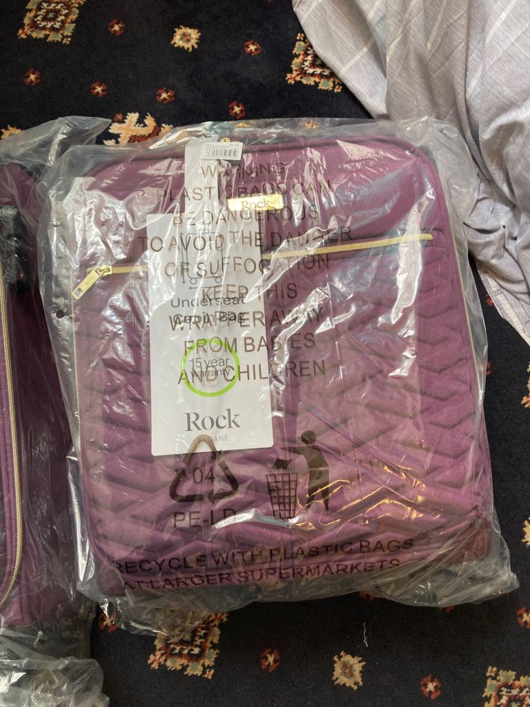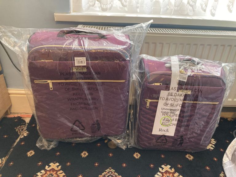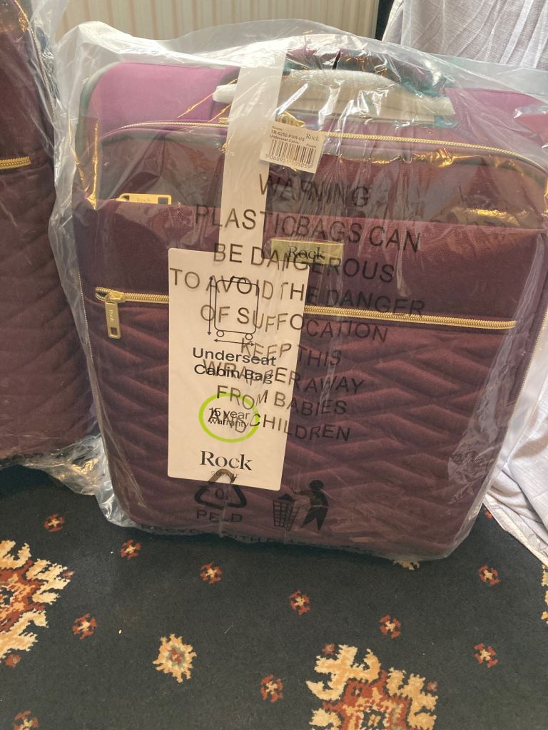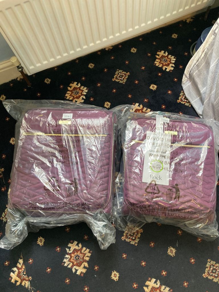 From a British company these suitcases are strong and hold a lot of stuff, it has 4 wheels and has a zip at the front and they are brand new package. Small and medium size