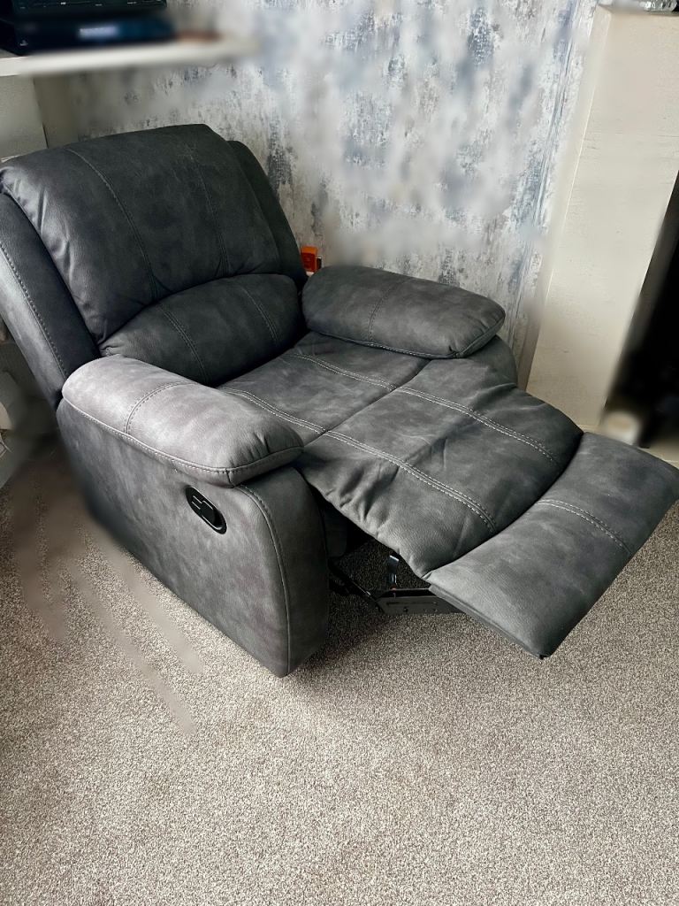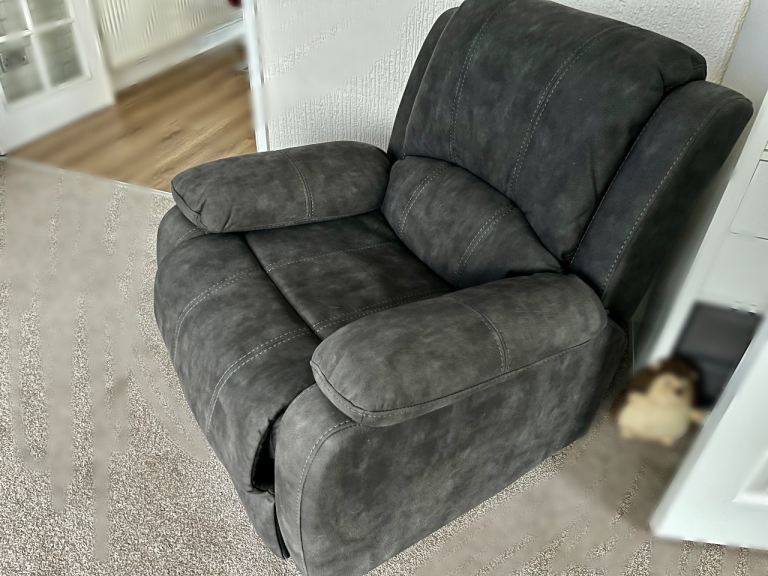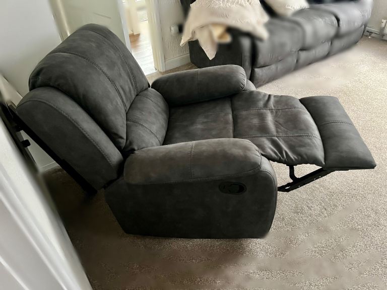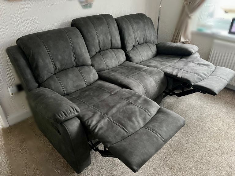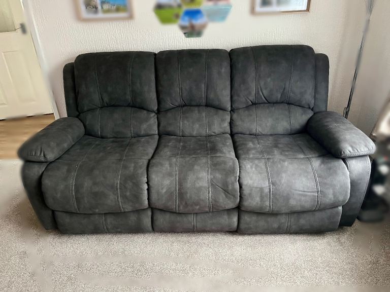 Excellent 3 piece recliner suite. 4 of the 5 seats recline (manual). Perfect condition, only 1yr old with no rips or marks. Grey shaded colour with a lovely suede feel. This is a really nice suite which is no longer needed.