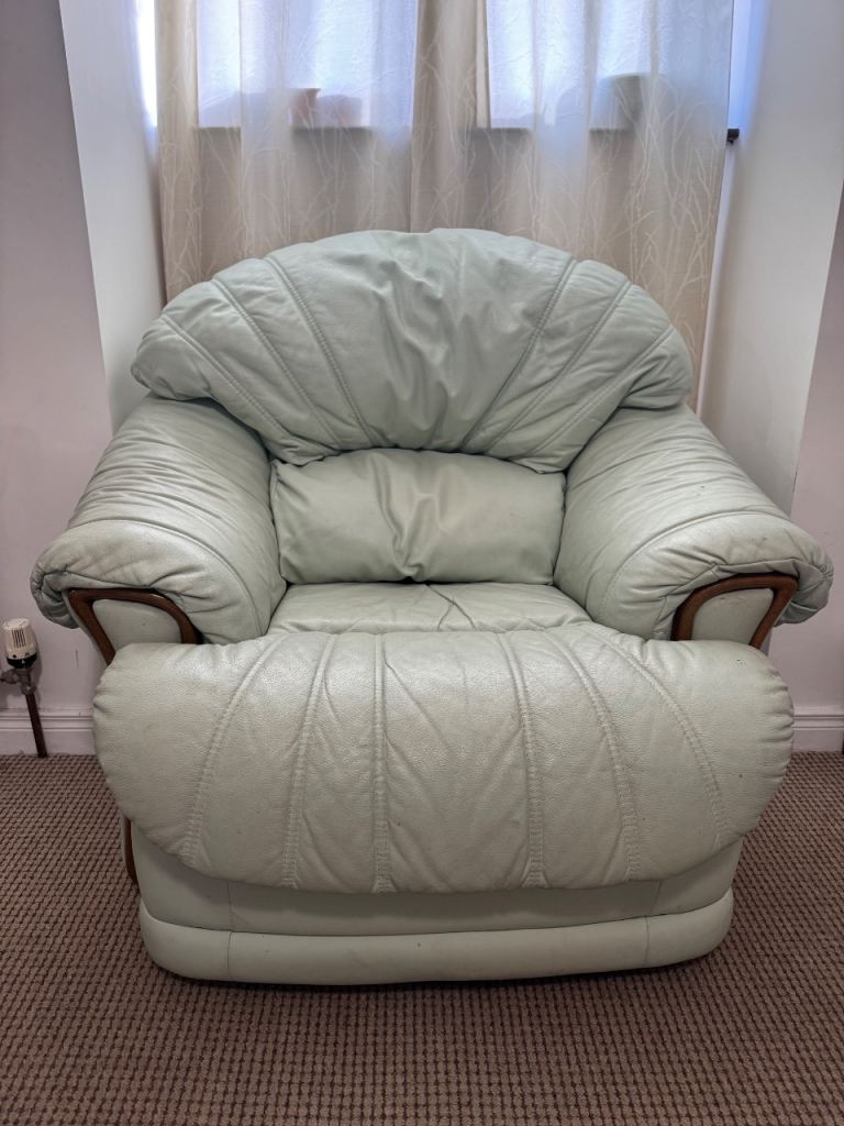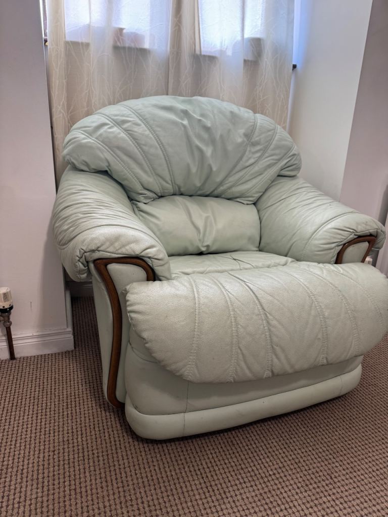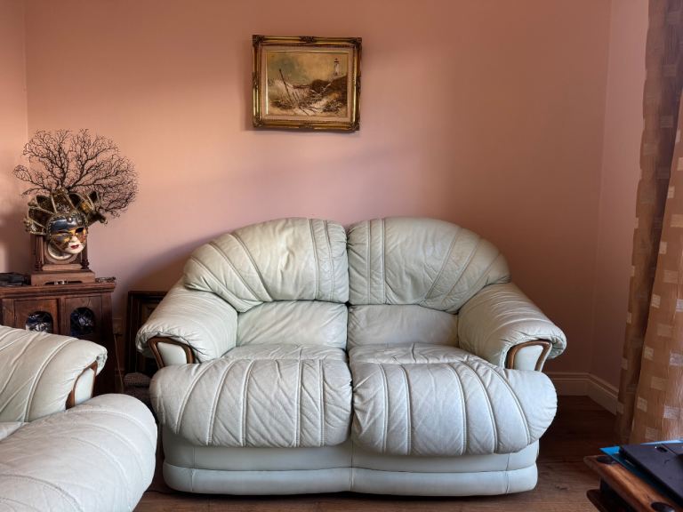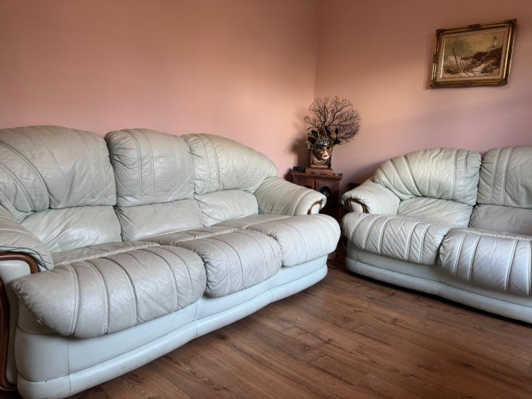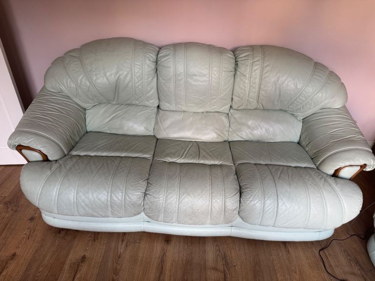 Stylish and very comfortable sofa set in a beautiful light green color that complements any wall paint. High-quality build and in very good condition. Perfect for any living room.