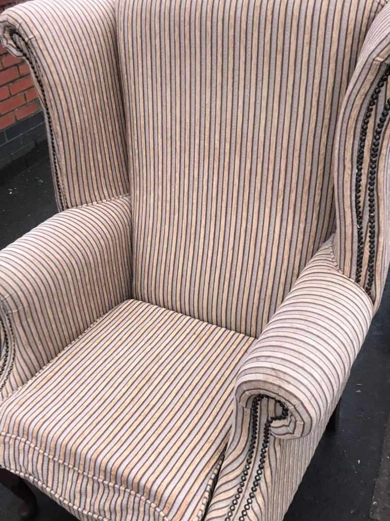Armchair, excellent quality winged back, high back and very supportive! light brown and green stripes. lovely condition and very little used. possible local delivery 65 pounds.