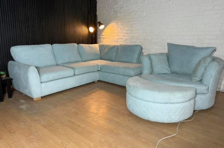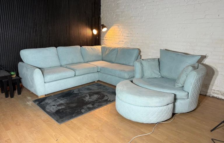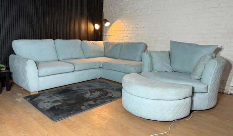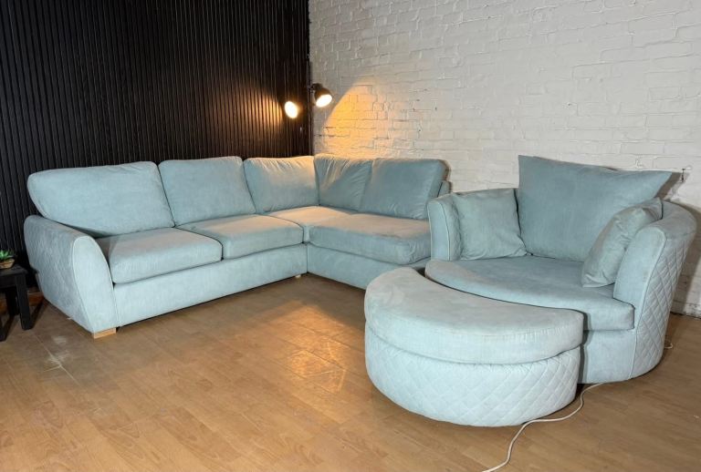 DFS ORKA Baby Blue Corner Sofa, Swivel Chair & Footstool Set