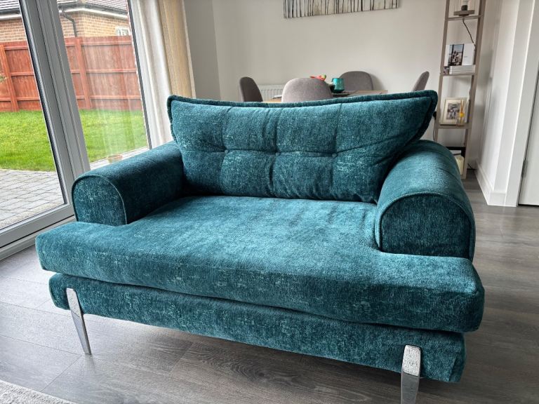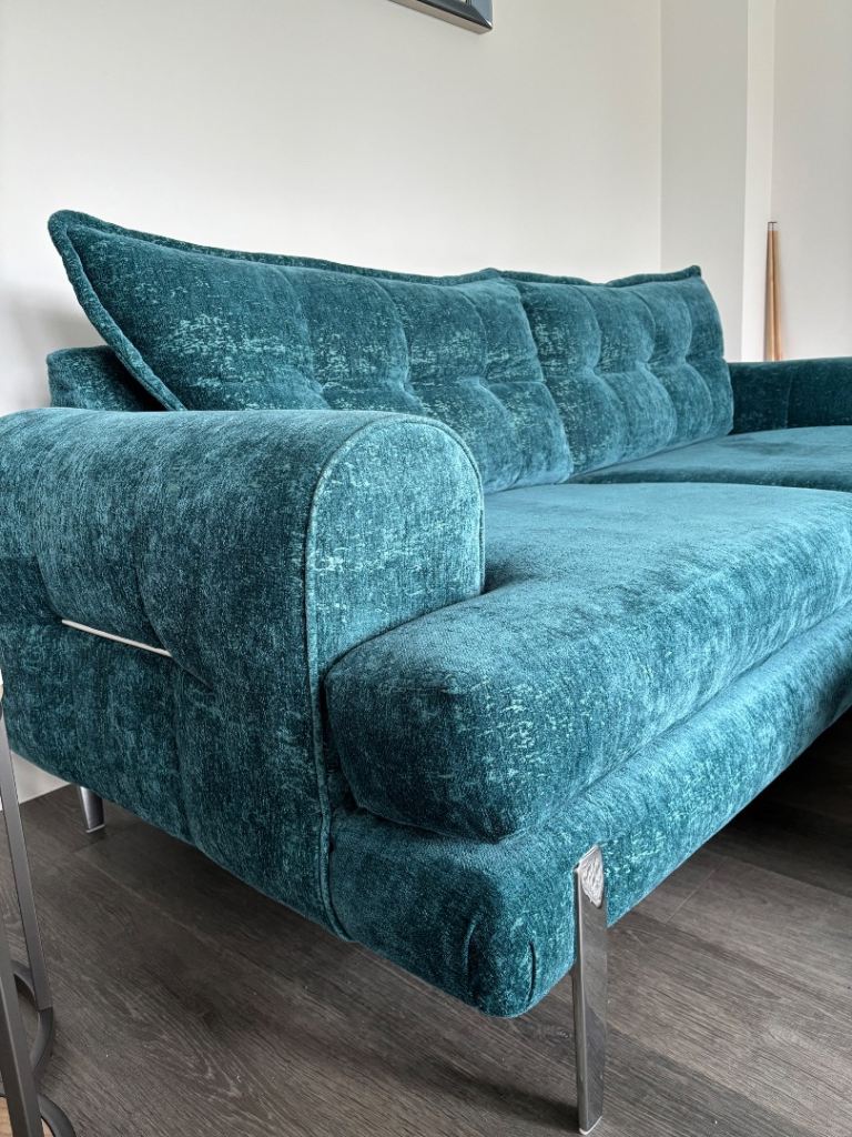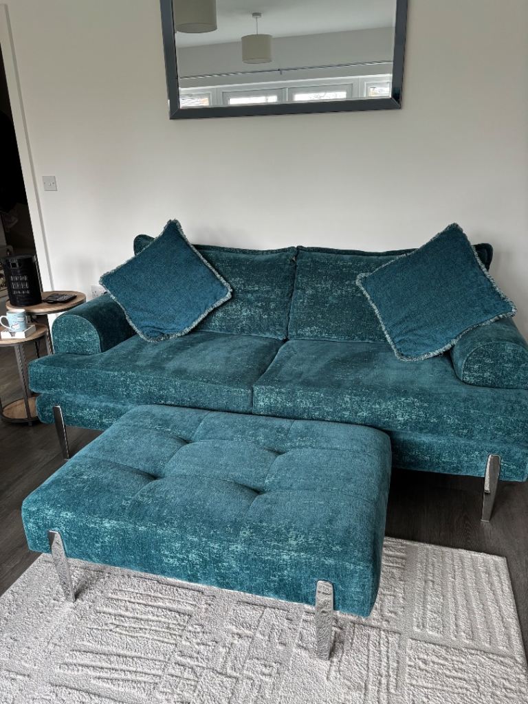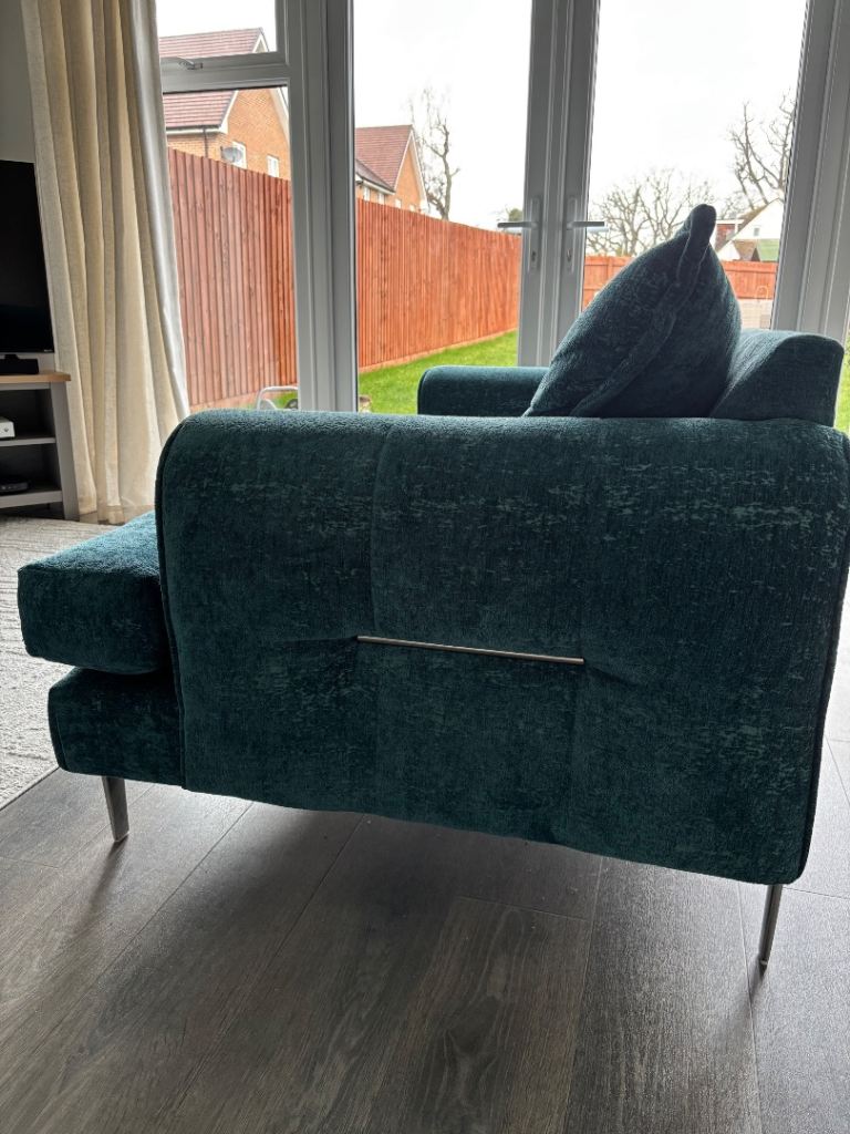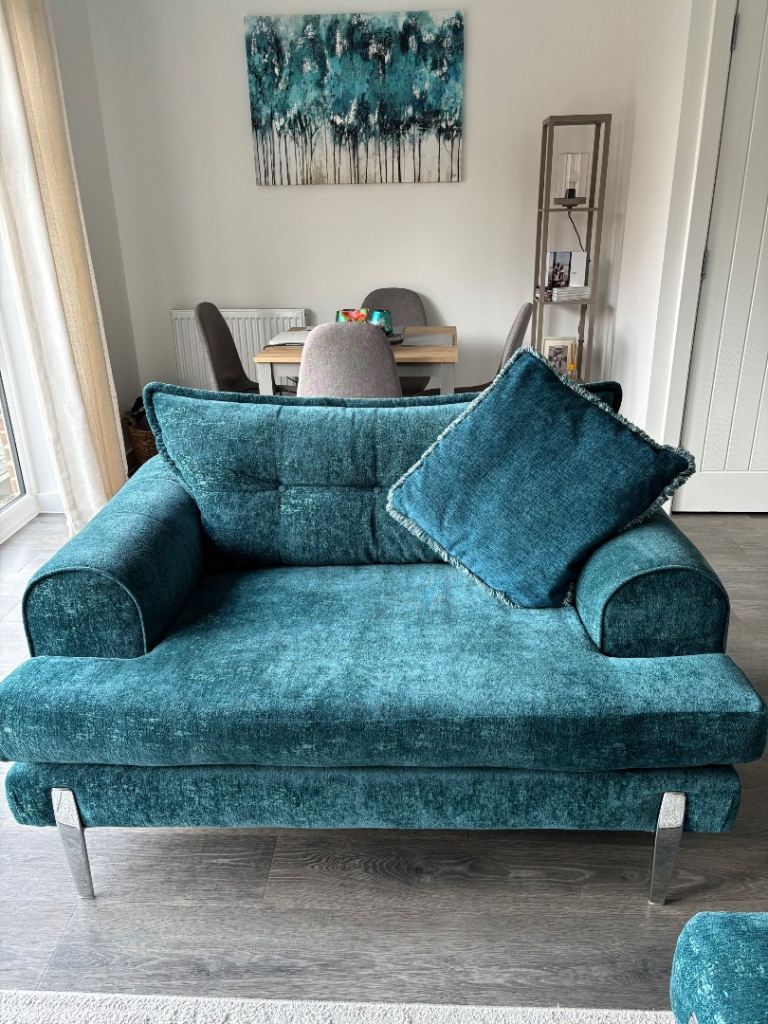 Teal with chrome detailing. Less than 4 years old. Excellent condition! Smoke free, pet free home. Selling the set due to re decorating. This set is no longer available to purchase on DFS. Available asap.