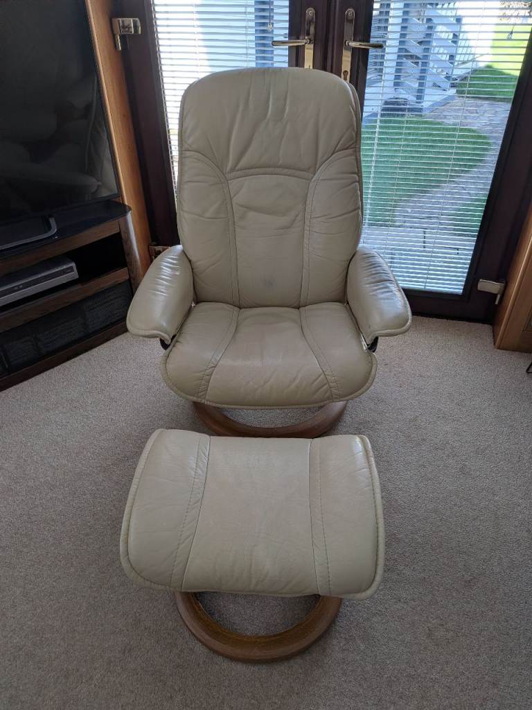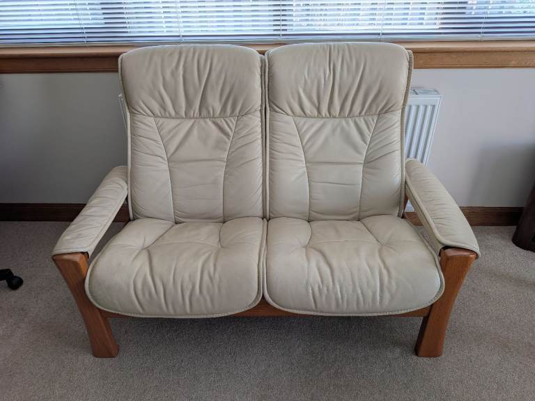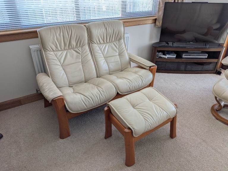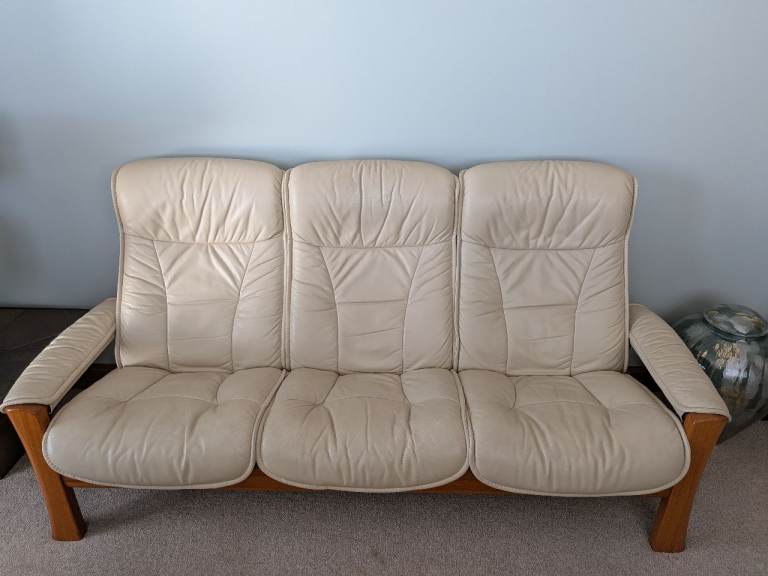 Erkones Stressless 3 piece suite, cream leather seats with wooden frames, all seats recline.