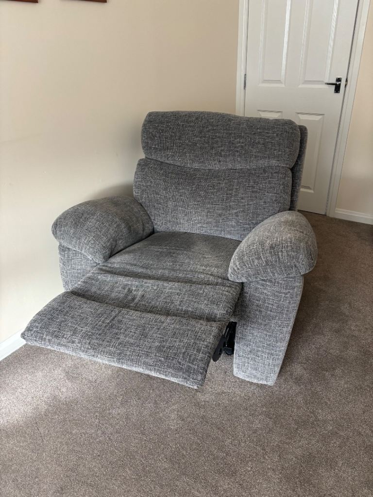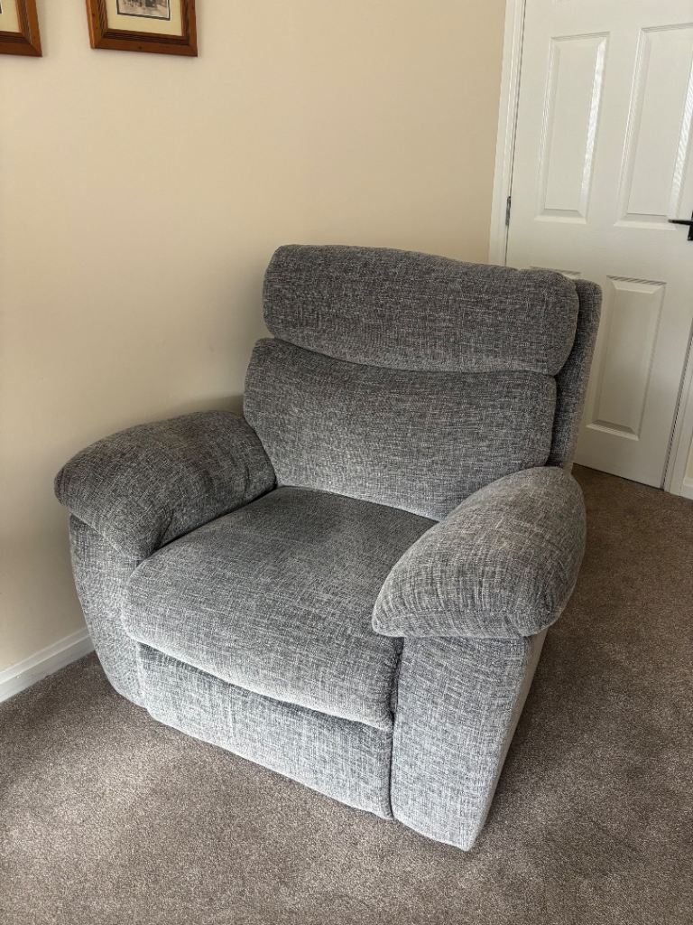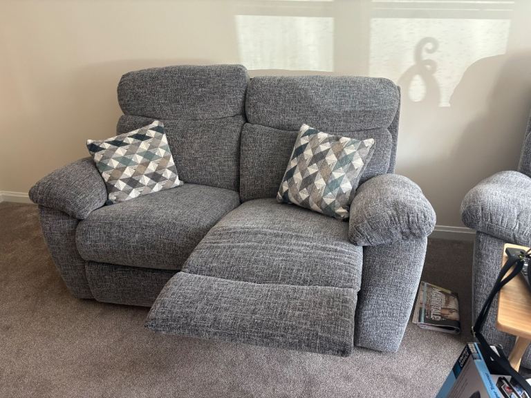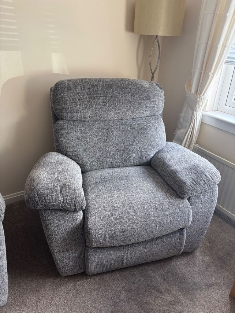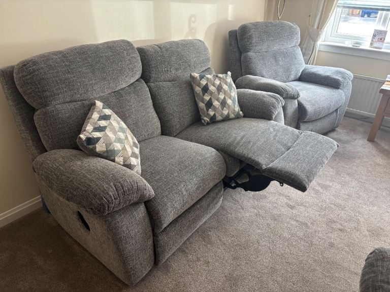 Grey 3 piece suite in immaculate condition. Three years old. One electric recliner armchair, other armchair and sofa manually recline. From a smoke free and pet free home. All items come apart for easy transportation and getting in and out of doors. Collection from Motherwell only.