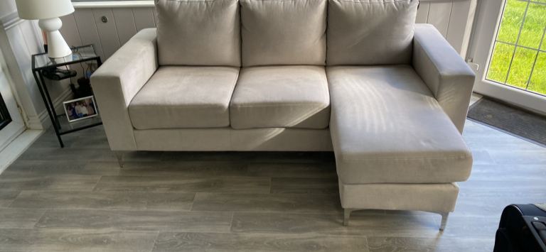 Grey three seater sofa l shaped new with steel legs very comfortable and a bargain