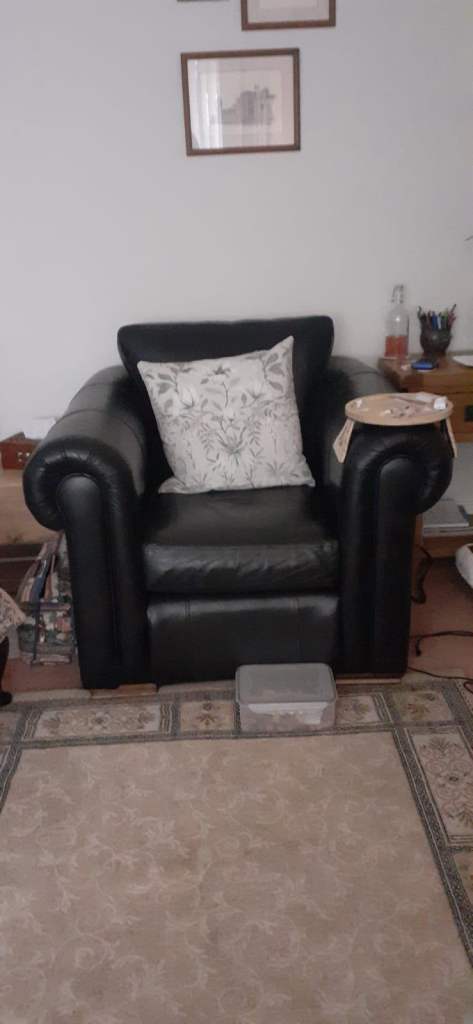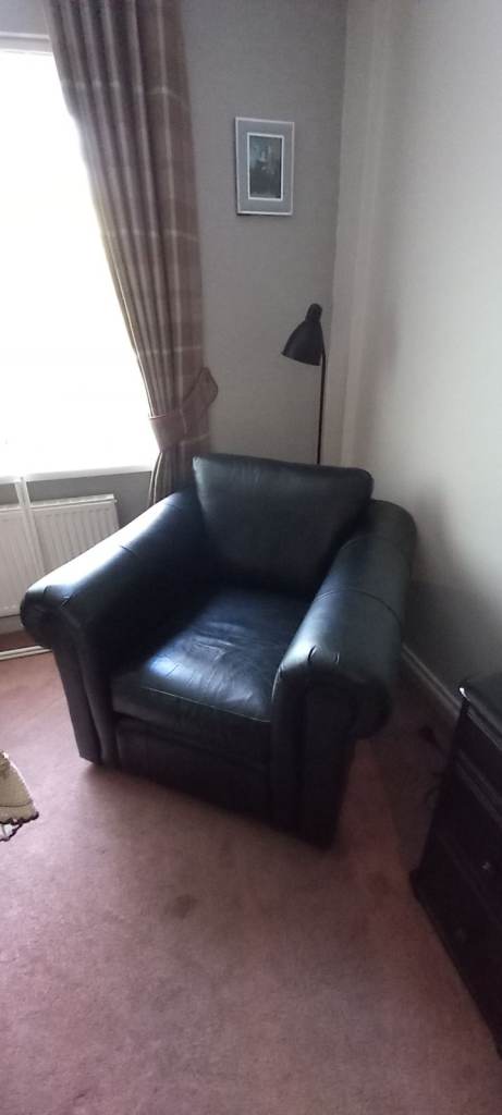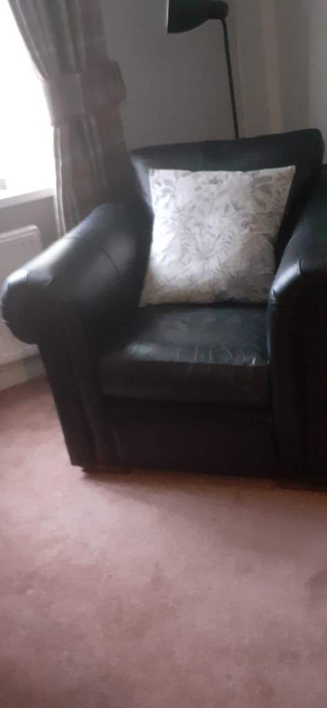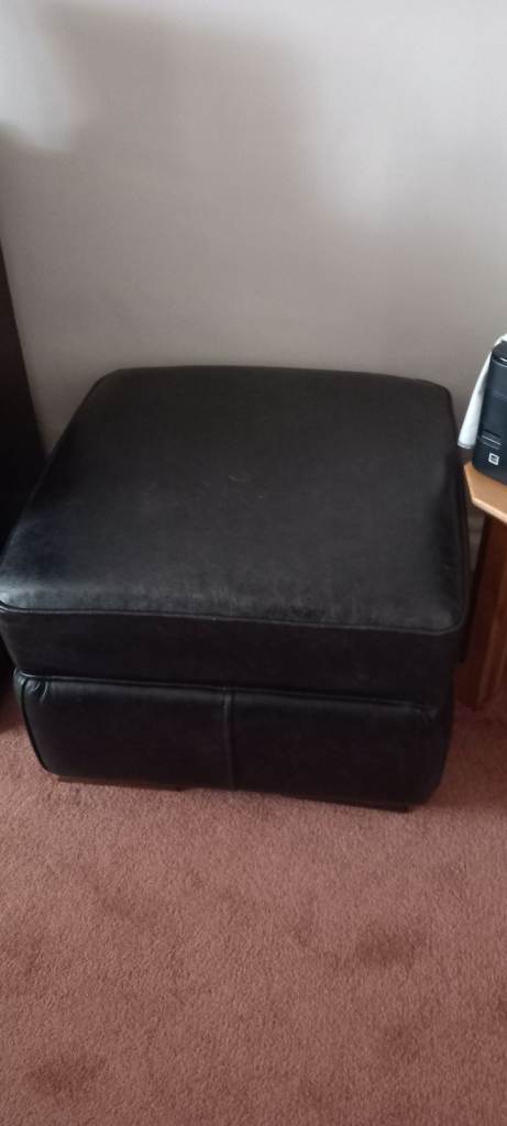 large four piece leather suite, two armchairs. sofa and foot stool. excellent condition two years old. Note this is a very large and extremely comfortable suite.
