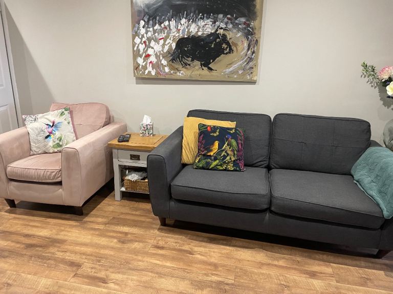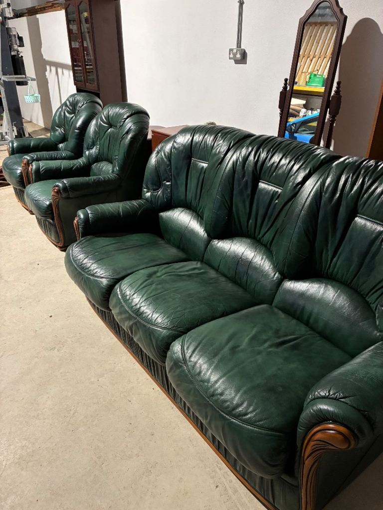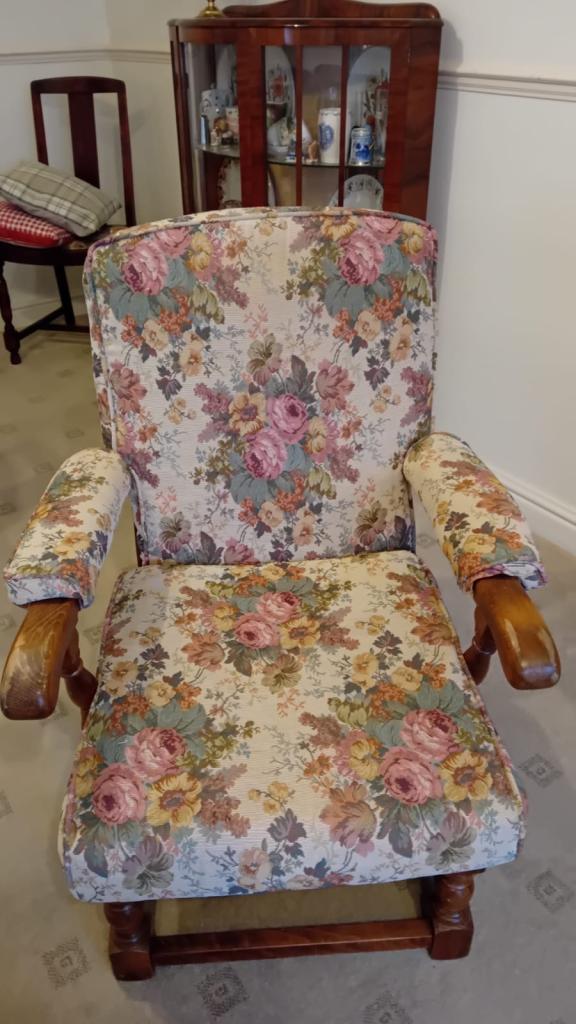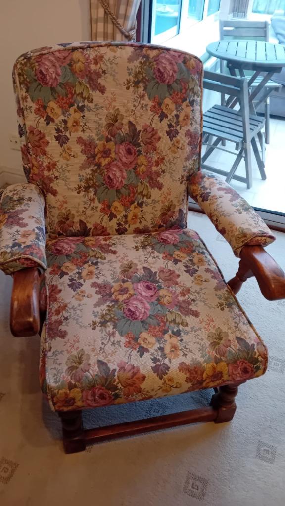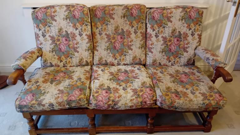 Made by Cryer Craft this reproduction vintage cottage suite with coffee table nest/side tables is in very good condition. There is some wear and tear. The cushion fabric and straps need replacing but the elm wood frame and tables have been well looked after. Would be a good project. Open to offers.