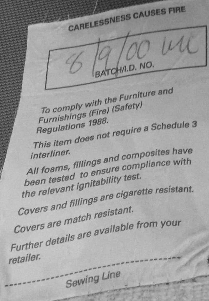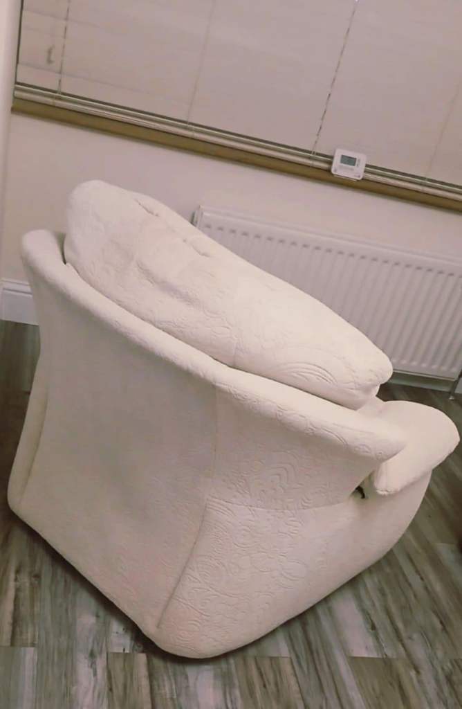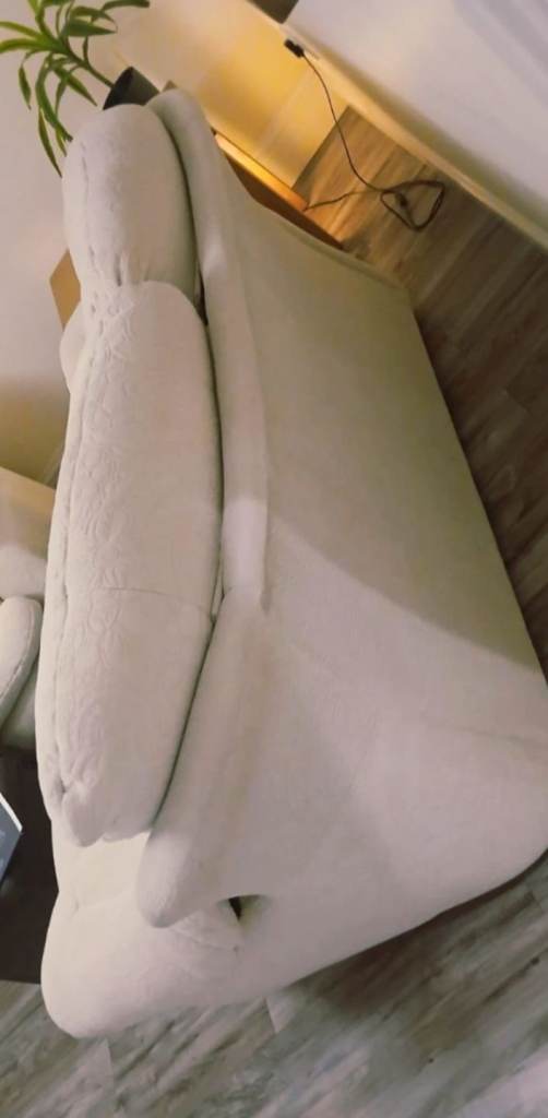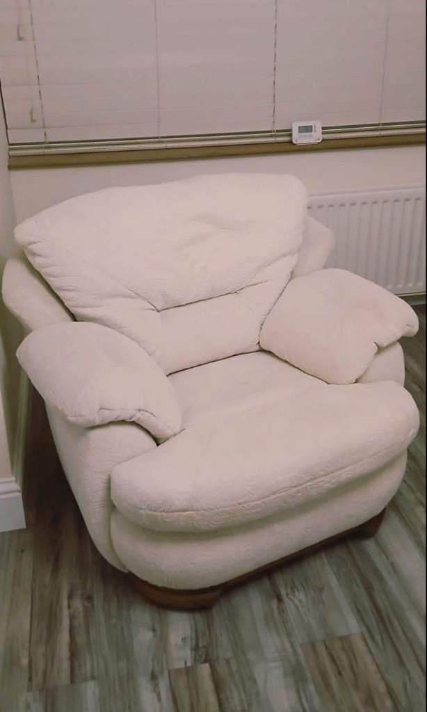 Large off white chenille fabric 3 seater, 2 seater and 1 chair, extremely comfortable. From pet/smoke free home. All cushions zip off and covers can be removed for washing. Chair hardly been used. See photos for care instructions and FIRE SAFETY LABEL. Cash on collection only please.
