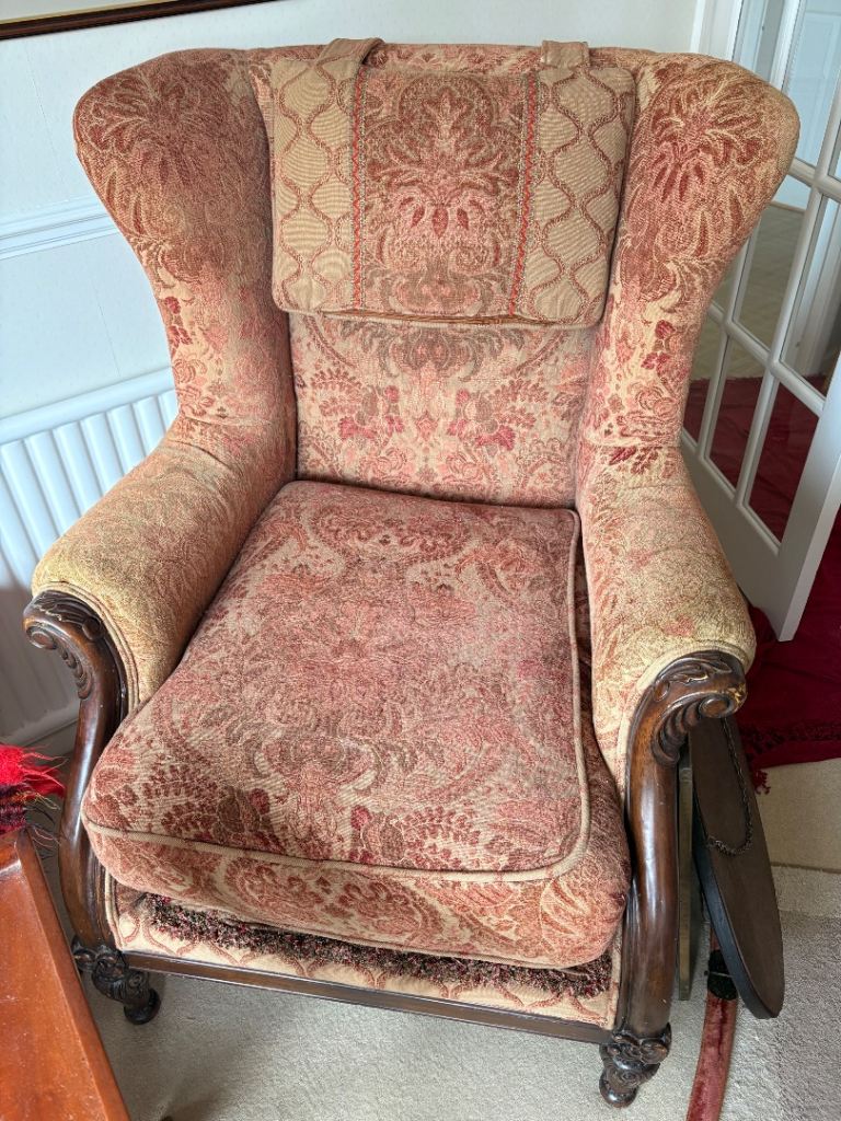 Comes with a two-seater sofa, a single armchair, and a winged armchair, all with a patterned fabric in an earthy 'other' colour.