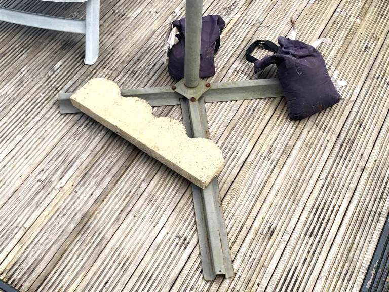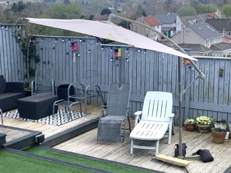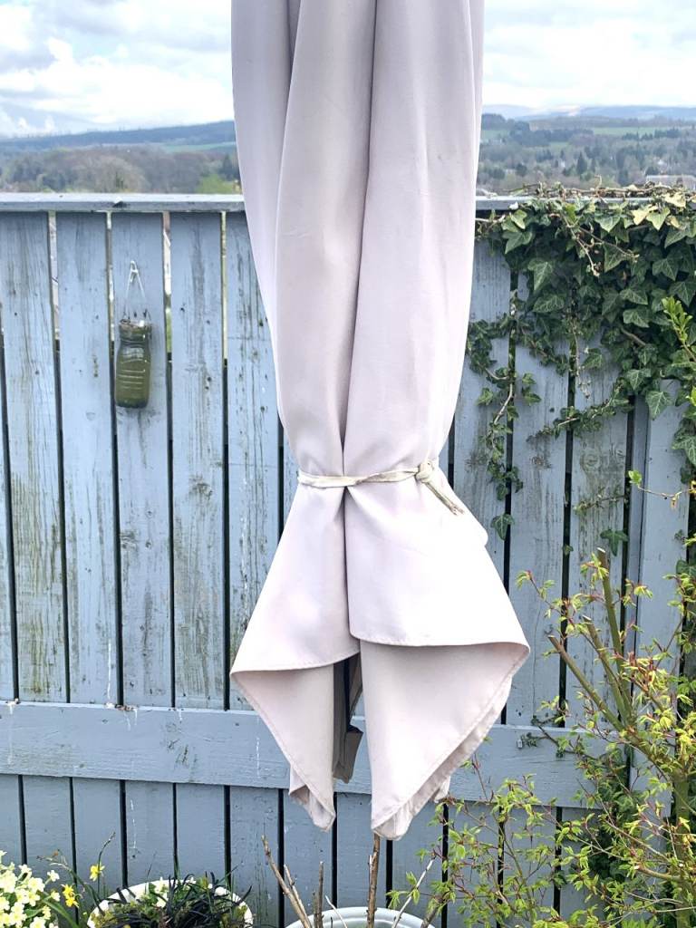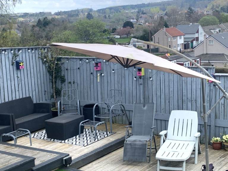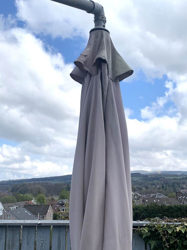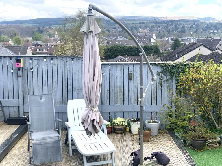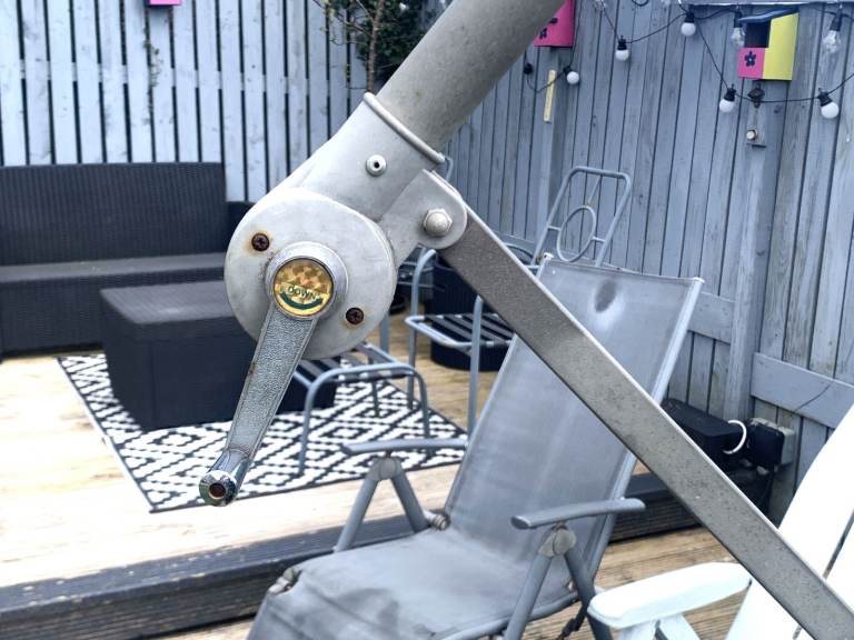 Large Cantilever Garden Parasol in Good working condition. It will need a clean up as it has been stored outside over the winter!