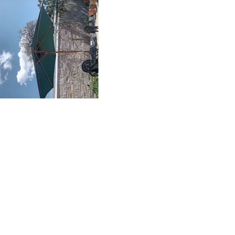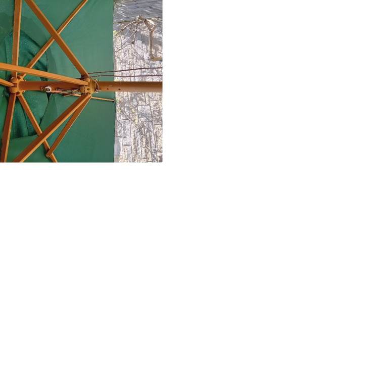 Large garden parasol with green canvas shade and wooden pole.